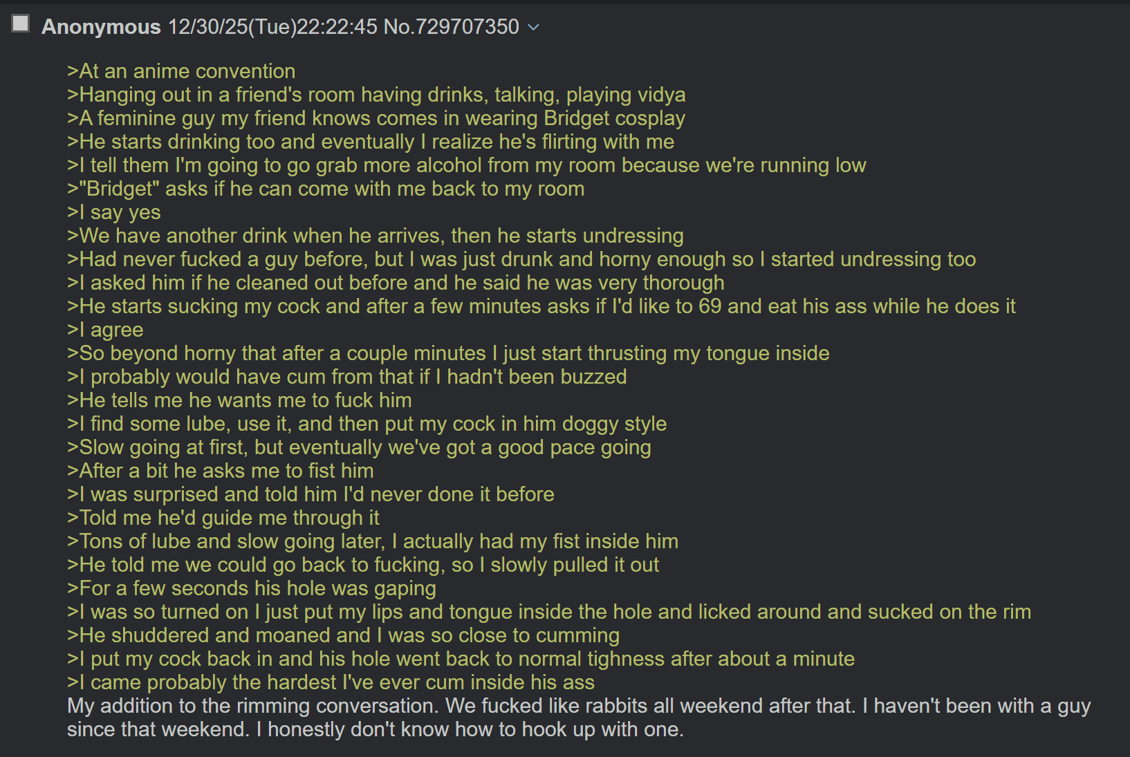 >>804238052010s 4chan was prime for cute boys in hiding. They melted under just a few compliments and awakened me to the beauty of sweaty gay hotel room cosplay sex