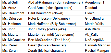 >>80450336lets go digging>>Ms. Dreissenhttps://en.wikipedia.org/wiki/Driessen>>Ms. Beaumonthttps://en.wikipedia.org/wiki/Beaumont_(surname)>>Ms. Perezhttps://en.wikipedia.org/wiki/Perez_(given_name)https://en.wikipedia.org/wiki/P%C3%A9rez>>Ms. ZerahClosest thing I could find is https://en.wikipedia.org/wiki/Zerah>>Mr. MaartanNo Maartan but Maarten is a thinghttps://en.wikipedia.org/wiki/Maarten>>Mr. al-Sufihttps://en.wikipedia.org/wiki/Abd_al-Rahman_al-Sufi>>Mr. Johnhttps://en.wikipedia.org/wiki/John_(surname)https://en.wikipedia.org/wiki/John_(given_name)