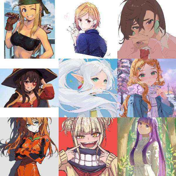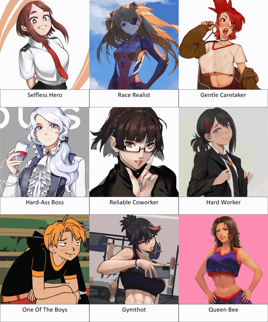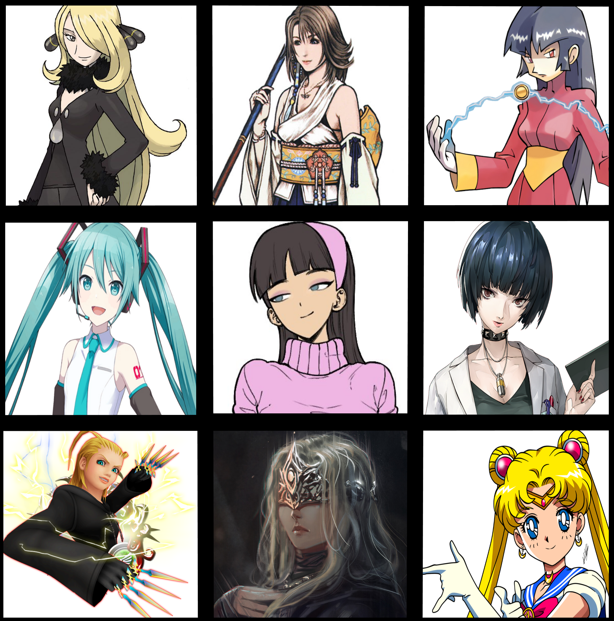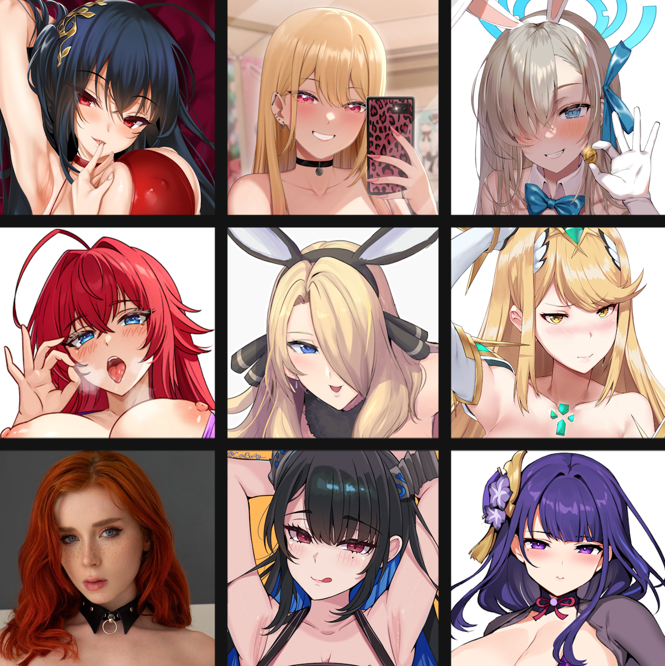 >>80428610i'm dumb...Taihou (Azur Lane) Marin (My Dress Up Darling) Asuna (Blue Archive)Rias (High School DxD) Cynthia (Pokemon) Mythra (Xenoblade)SweetieFox (real life) Nerissa (vtuber) Raiden Shogun (Genshin Impact)I'm not all that attached to most of these to be honest, haven't even played or watched all of their things. I just thought they'd be good picks to fill the grid and to get the boys horny~