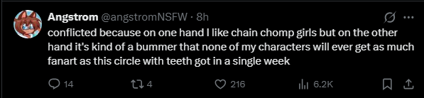>>80465362he needs to milk it while he's still relevant, pump some merch like stickers or something, once people move on his tweet about no one liking his oc's will be more true than ever