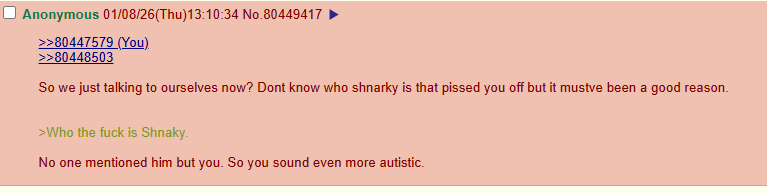 >>80447579>>80448503So we just talking to ourselves now? Dont know who shnarky is that pissed you off but it mustve been a good reason.>Who the fuck is Shnaky.No one mentioned him but you. So you sound even more autistic.