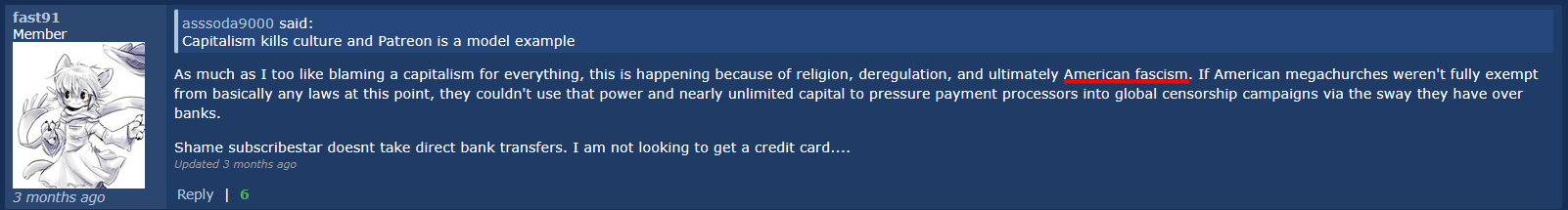 >>80451369>The latter got banned from Patreon.And everyone else's response was "Capitalism is killing commerce", "Fascism done it again", and "Cub is 100% legal. It was the voodoo dolly."