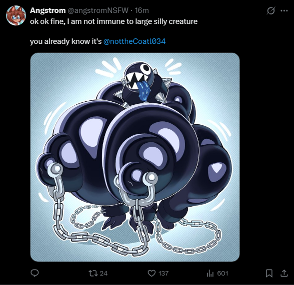 >>80444452Lol he deleted the tweet and ended up drawing the chain chomp oc anyway. He couldn't resist chasing the trend could he?