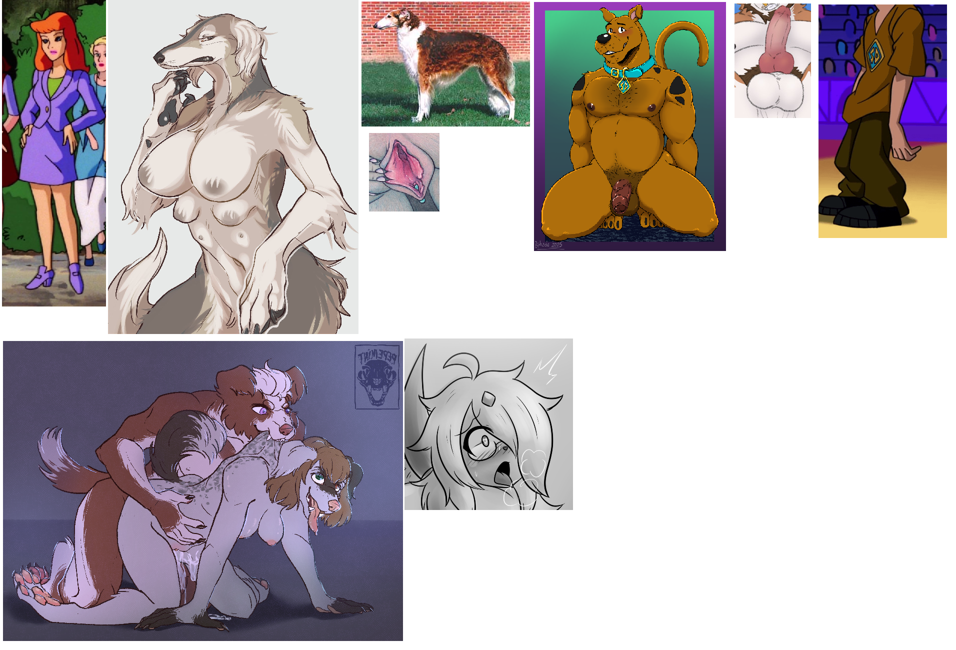 >>80453170Requesting adult!Daphne (Like from Scooby-Doo on Zombie Island) TFd to an anthro red borzoi like in the pic being bred by an anthro Scooby-Doo, who is biting her scruff and she has an expression like in the Absol pic.For further specifics, Scoob's body type should be something between the two Scoob pics in the refs, he should have multi man nips, and Daphne should have nothing but her purple shirt on like in the pic I provided, but unbuttoned.
