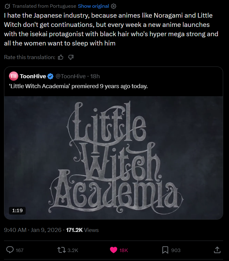>>80477154I mean technically it didn’t. The anime yes but the pilot released way back in 2013. Also a very silly thing to complain about because anime “like” Noragami and LWA are still being made to this day while most of those isekai get one season tops and are also left to rot. These people scarcely have any idea what they’re talking about.