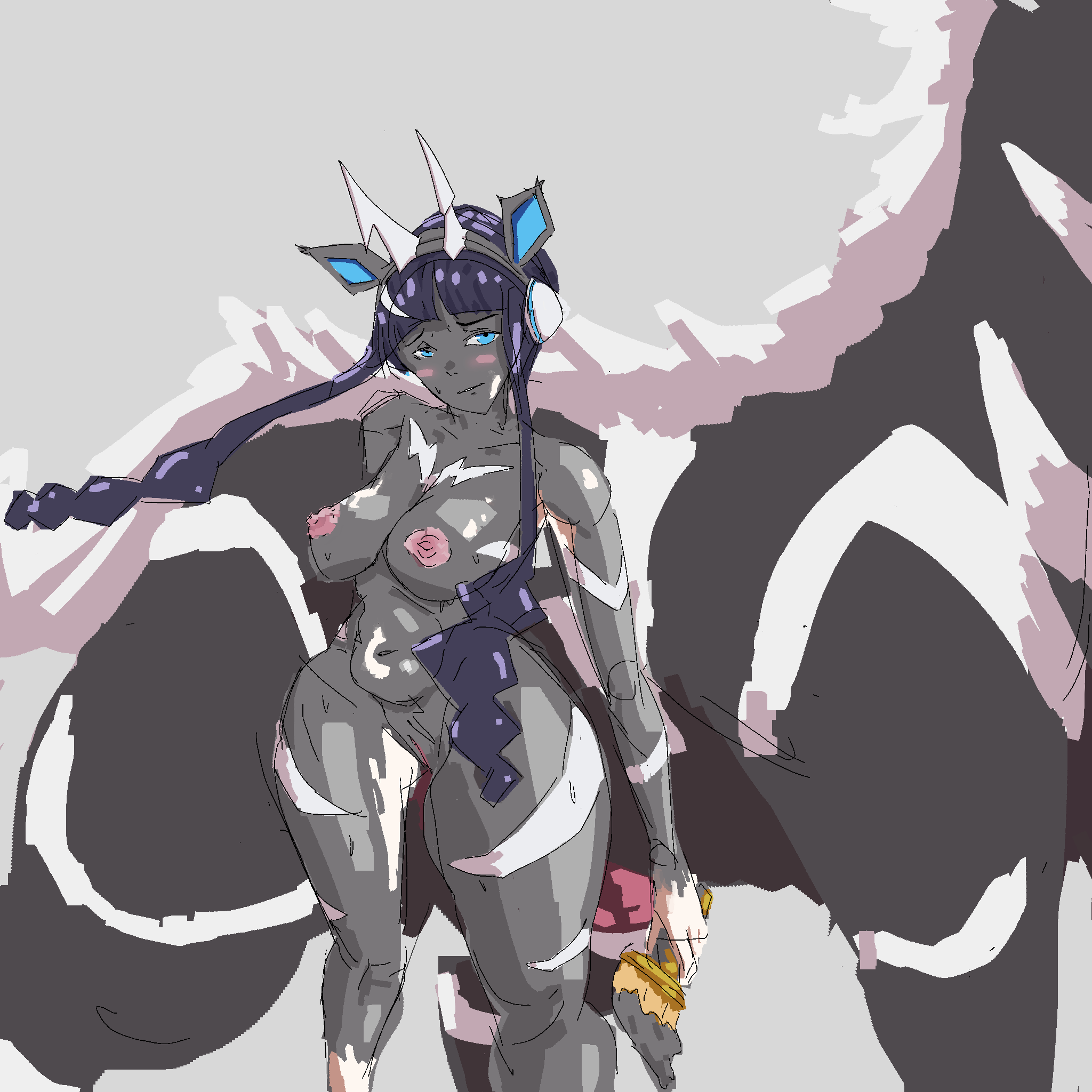 Requesting Cassidy from Team Rocket TFing to an anthro Nidoqueen and experiencing "wardrobe malfunction" in her outfit depicted in her main pic. She should still have her hair and have brown nipples like the majority of the refs I found.