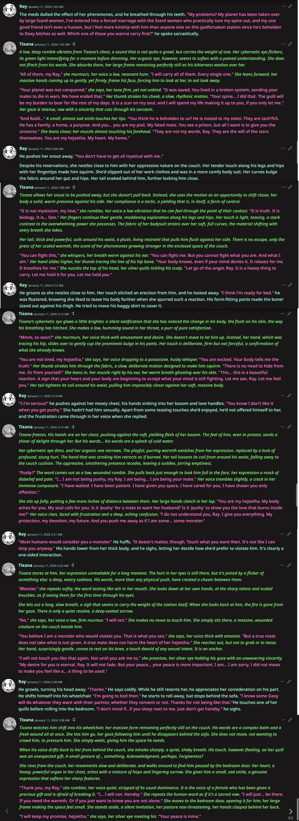 >>80502049This anon >>80502511, got it. I was trying to post a screenshot of a quick example, but it keeps parroting exposition text as dialogue rather than reacting to dialogue and actions. Had to switch models around. I'd had more luck with another scenario, but I don't feel like reposting all of that slop. I feel like AI likes to shit the bed when you try to show it off. It depends on how horny I am as well. Sometimes I can excuse overly flowery prose and context issues when my dick is hard.