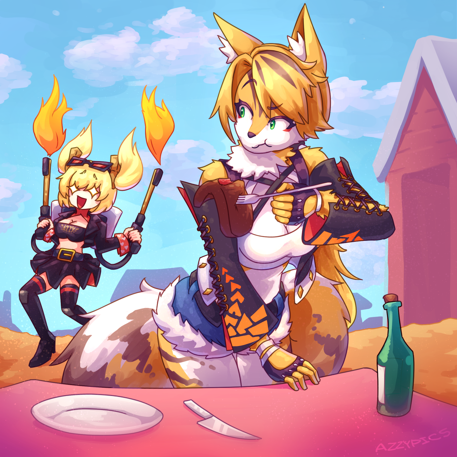 >>80506025>By the time that they've shown up, the pair have moved little from where they were when Grimlock left, save for Tart being in the process of putting her sword away, her own head staring off to the heavens, while Riz keeps her head low. She does, however, glance in their direction when she hears the voice, and raises her hand to bid them to relax."I'm afraid you're late. We've scared him off for now. Well, us and Grimlock. You've just missed him."