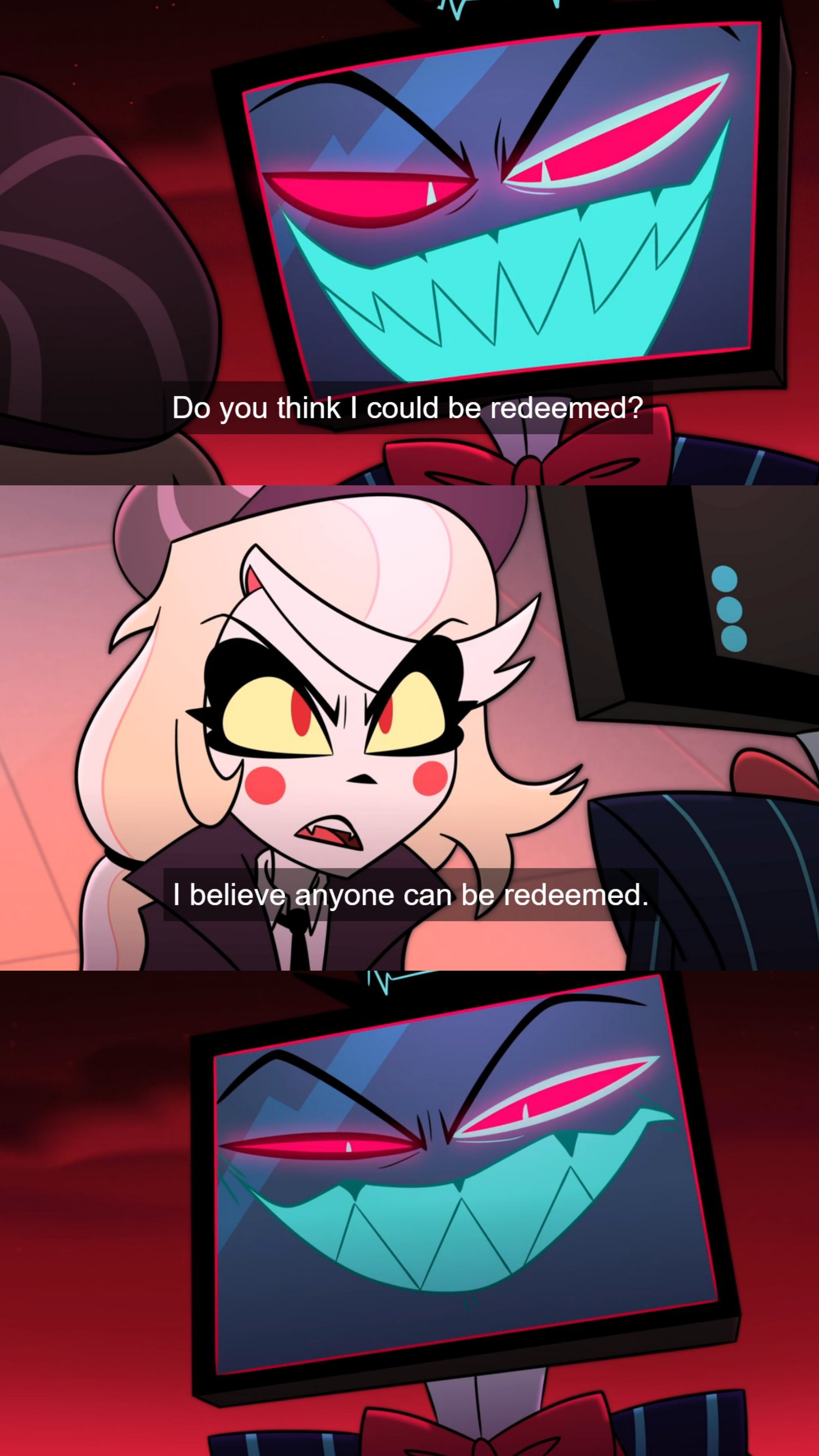 >>80545933Alastor being a big villain in season 3 doesn’t make any sense at all. The idea that maybe he would be forced to a position of choosing between Charlie and his desires makes sense, but him being the villain in Lilith season 3 would be a pacing nightmare hell. Look at seasons 1 and 2. We can’t develop Alastor into joining Lilith mid-season to be a main threat cause we don’t even have enough time for that.