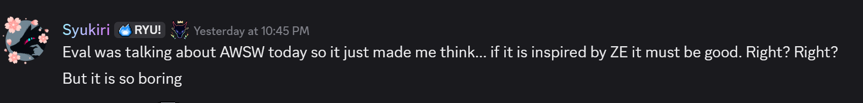 >>80588219>Sorry to ruin the fun but that was me.AWSW is my favorite game.I know Zero Escape is her favorite game.So I DM'd her that fact when I read it.To get her to play AWSW because she kept shitting on it.Did not expect her to read it instantly but she lost her shit when I mentioned Zero Escape.>posts a pic of a wyvernAh, hello there Eval. While I always knew you hung out here, I didn't realize you actively posted. In retrospect, it seems kinda obvious.