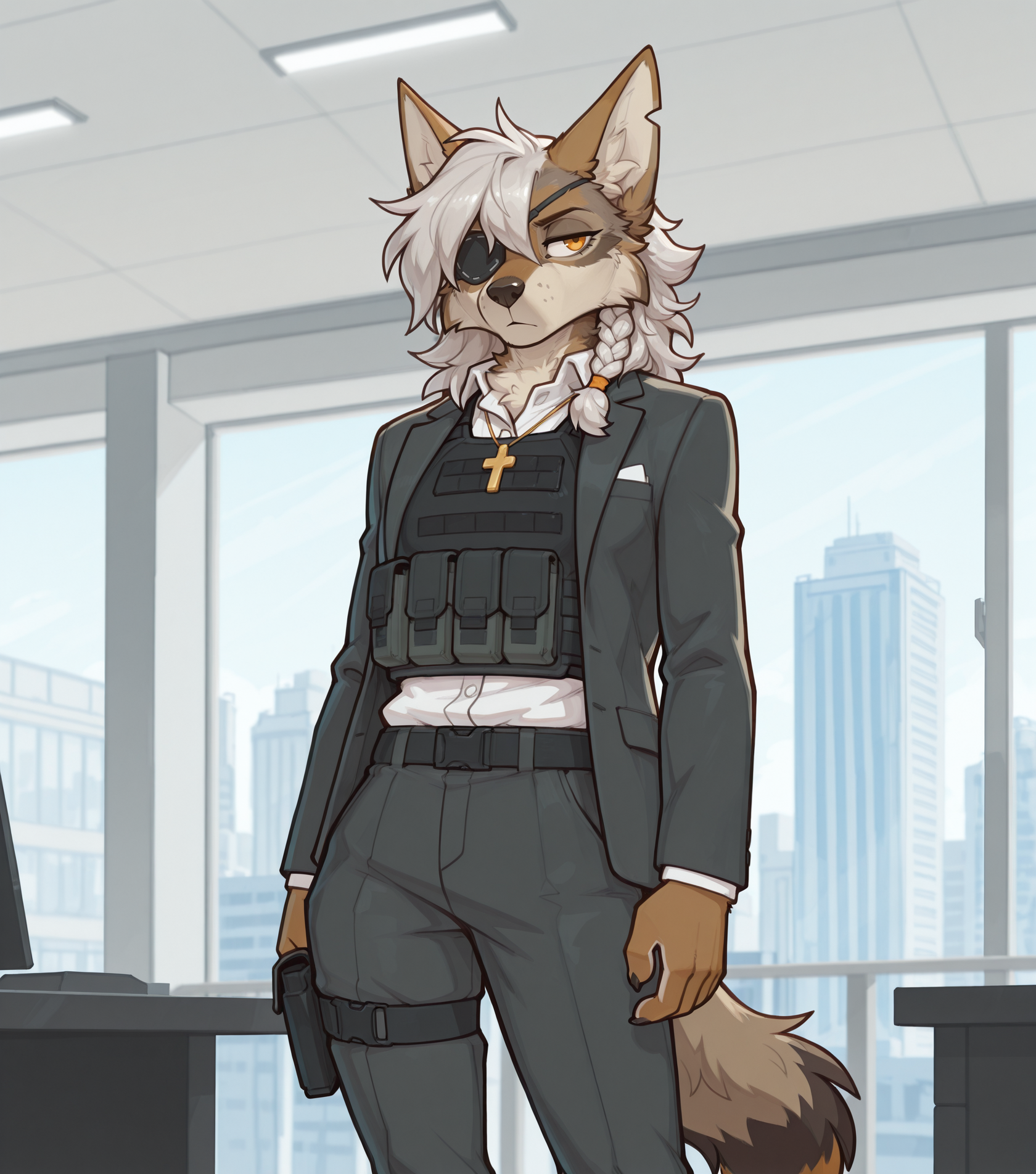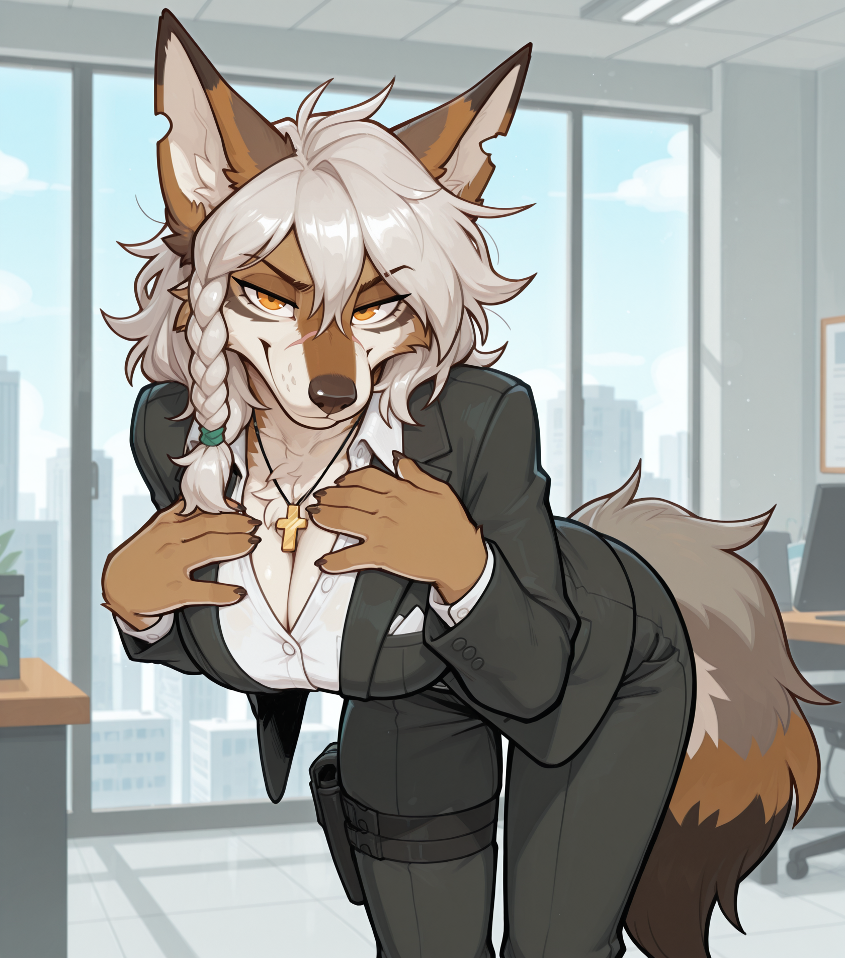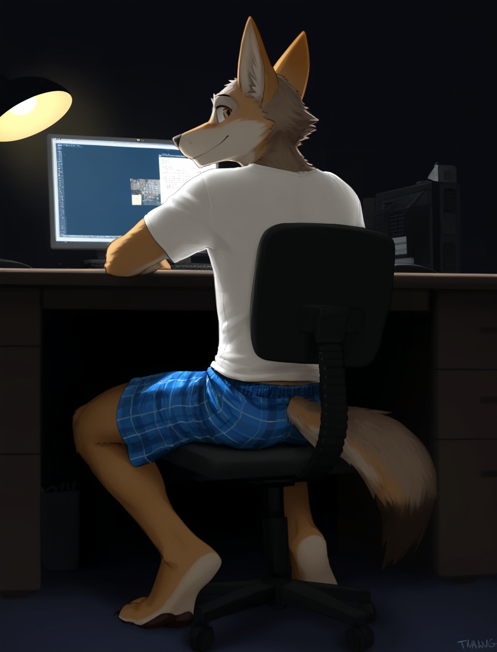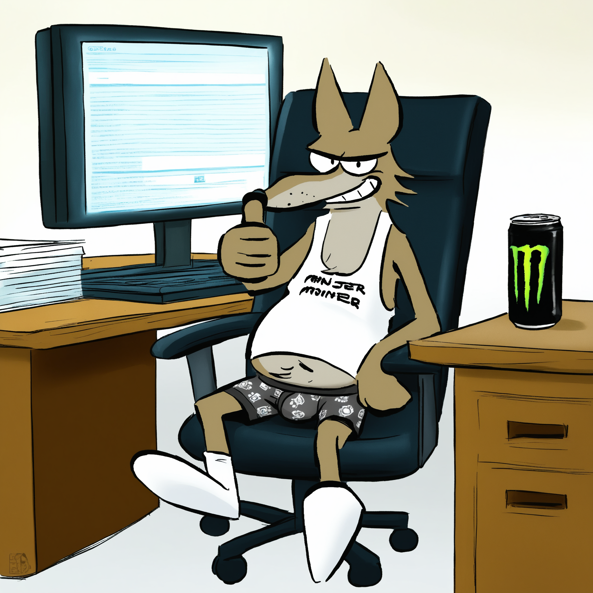 >>80596401Cant gen right nowBut a chubby coyote with a business casual top wearing only underwear and socks