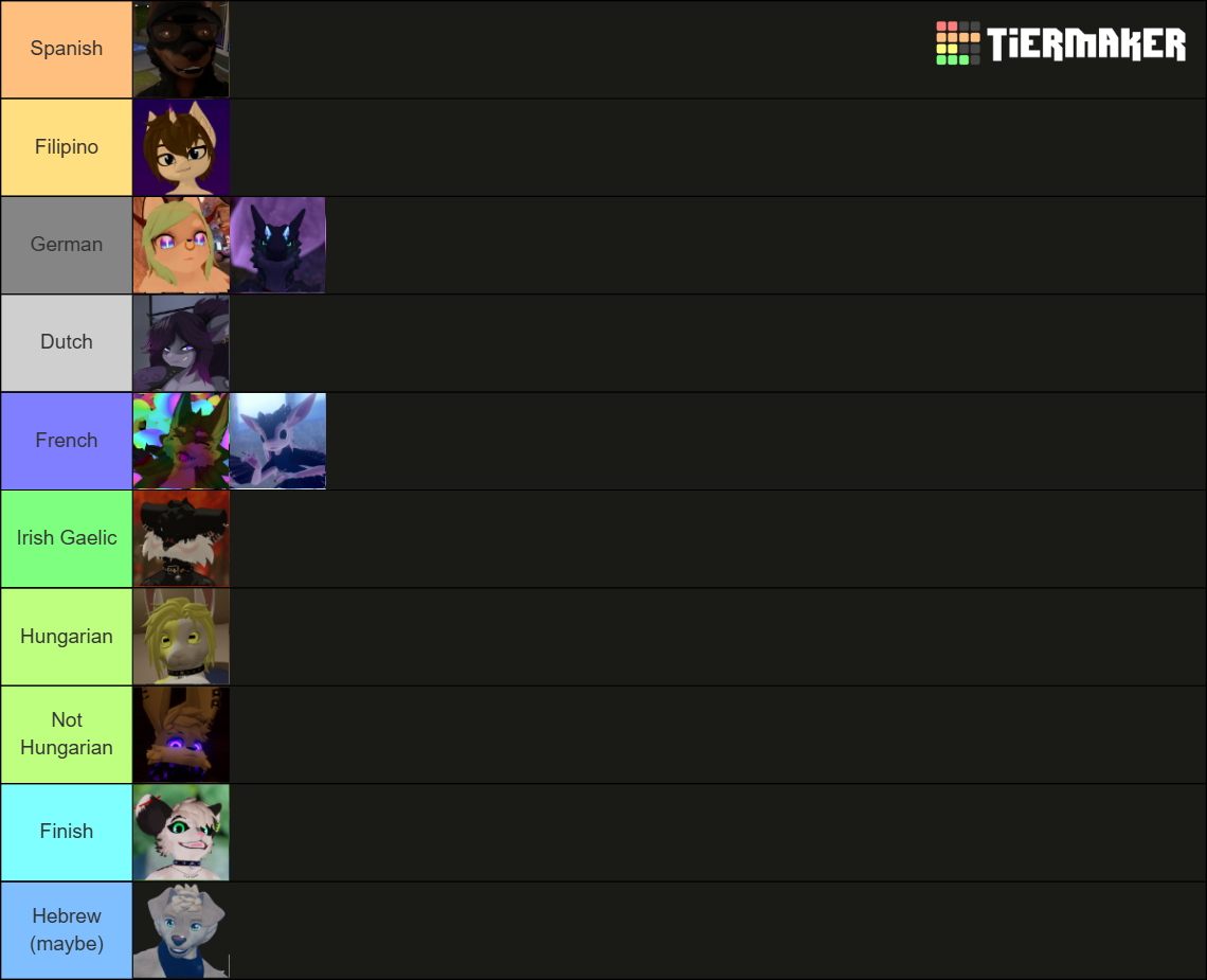 >>80605011Fixed a few.PK is Filipino.Photobunny is Hungarian.I'm German. There was another one who spoke German in the Christmas instance.MB had something something "the game" in Hebrew in the status.And not sure if Irish Gaelic counts or if the main language is English.>>80605435Dutch sounds like cute German and i really like the sound.
