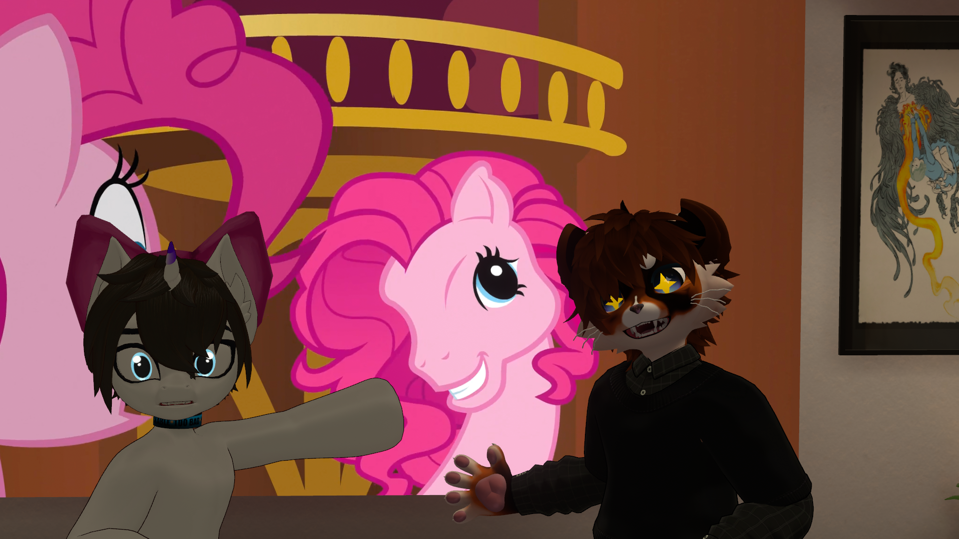 >>80605942Black cartoon wolf/dog and kobold turned pink cat also both speak Spanish iirc. McD and M if you need a hintdrop
