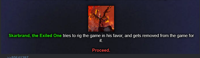 >>80640503Skarbrand, the Exiled OneI wish you guys would stop hosting shitty hg and play magic instead.