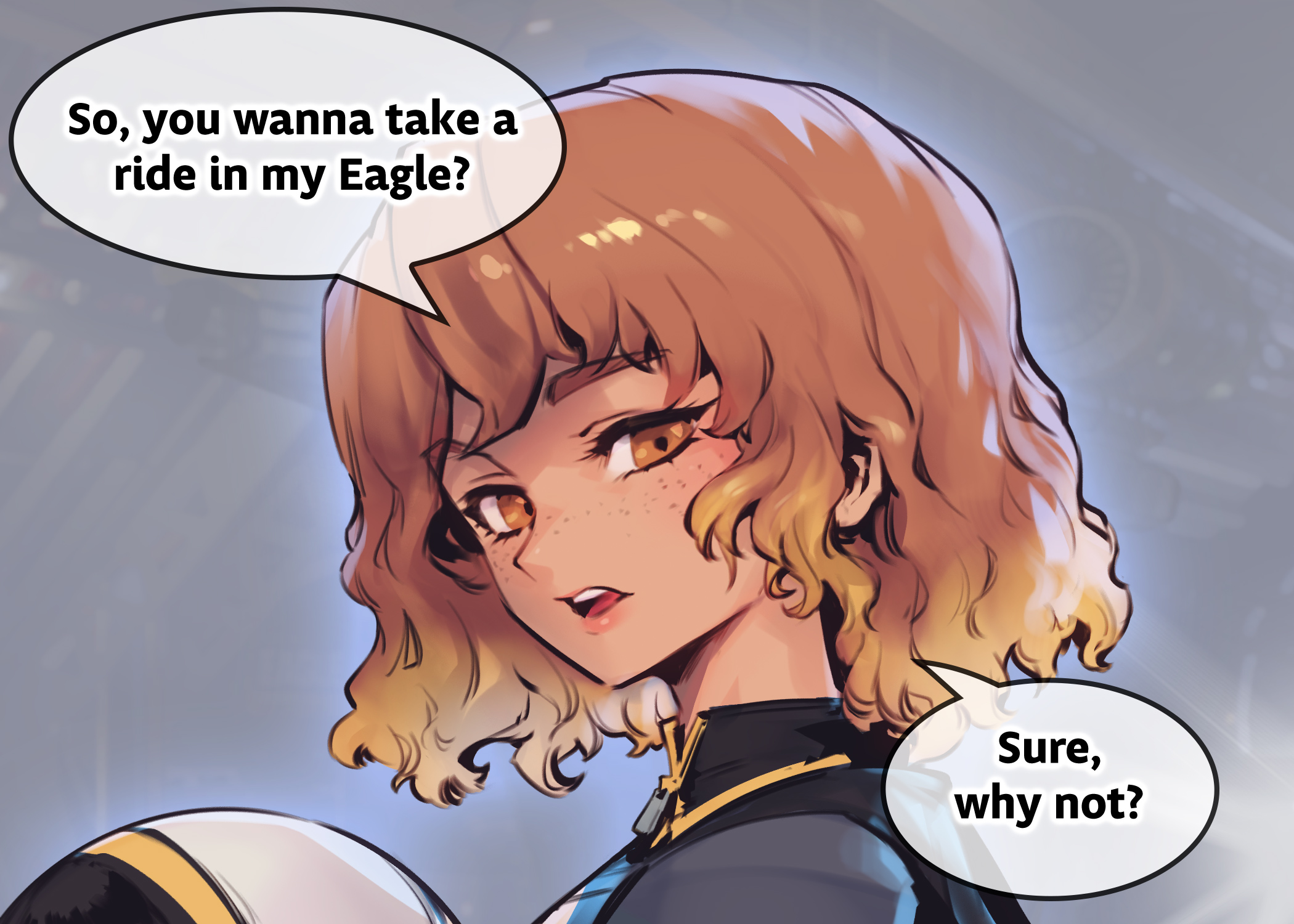 >>80644070Yeesh, easy with that grip there partner. I still need that arm for stuff you know?>When the ironclad grip finally releases, the pilot is left flinging her wrist about trying to loosen her fingers up a bit.My friends and those in need of a little backup call me Eagle. You might as well call me that too.>She turns away, waving over one hand over her shoulder. It's about time I get going. Nice meeting you Blaidd, see you around.