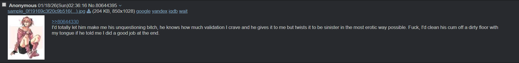 >>80649894how do feel about kosaku's new life as a dedicated sissy cumslut for /erp/?>>80649844do you like the new submissive and obedient kosaku more? he's probably not gonna come back here since he's enjoying his new life but you can go and say hi to him in /erp/ if you want. you can join him too if you want.