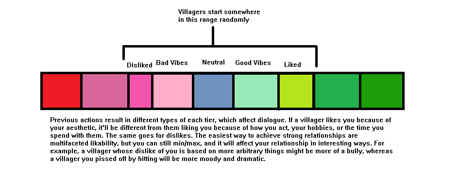 >>80649353Personally I want a hidden engagement meter built in that slowly pushes the envelope of discussion between you and the said villager where you end up in little minigames with them to further your relationship, even just casually going fishing with them where you make small talk would be fine.
