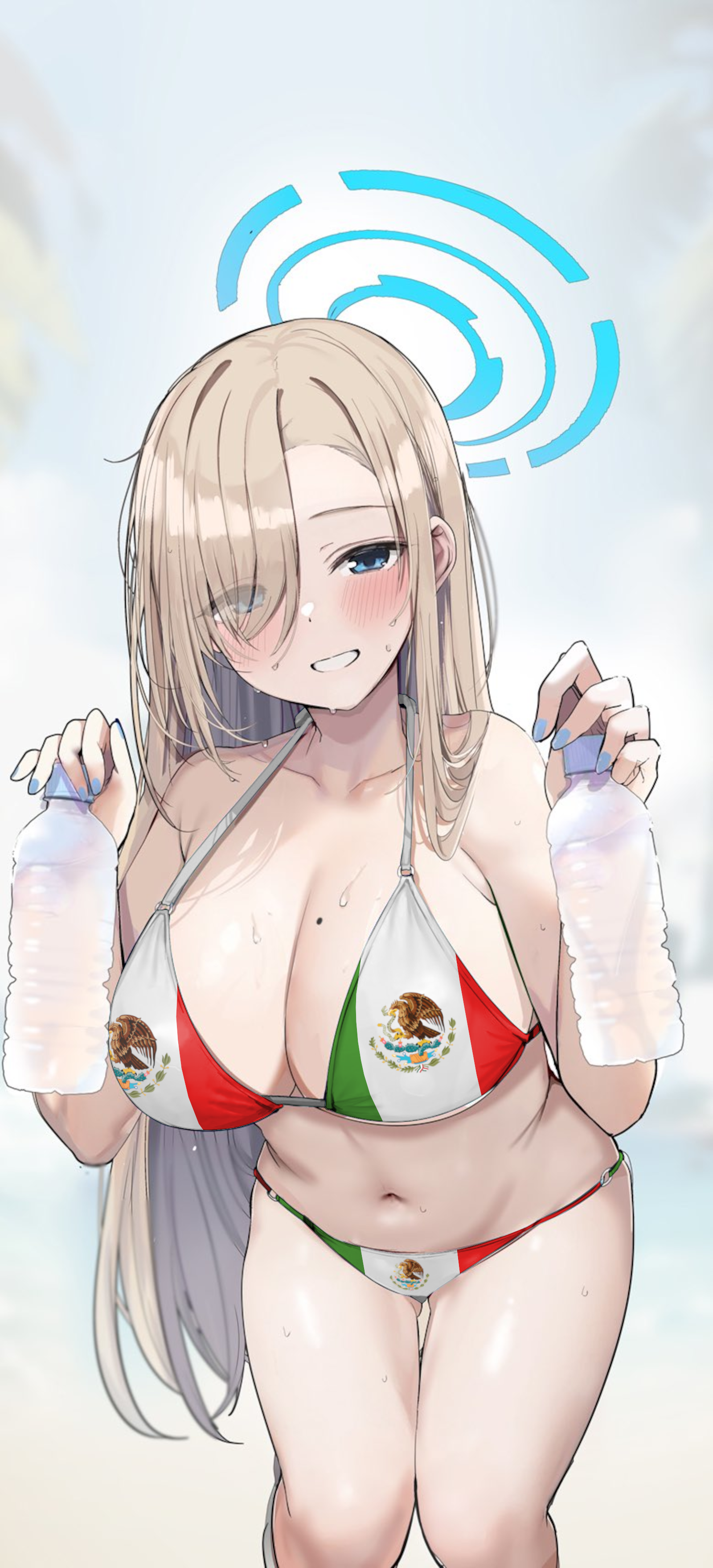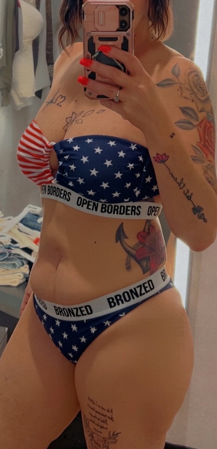 >>80664127>What prompt did you use for this picture?here you go.>edit her bikini to have a white band underneath the bikini top and a white waistband on top of the bikini bottom. On the white band of the bikini top write the words OPEN BORDERS on repeat in all caps in black text. On the waistband of the bikini bottom write the words BRONZED on repeat in all caps in black text.