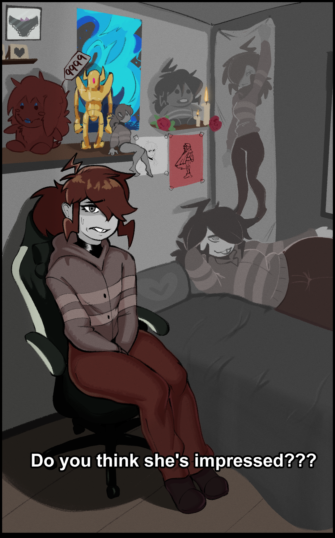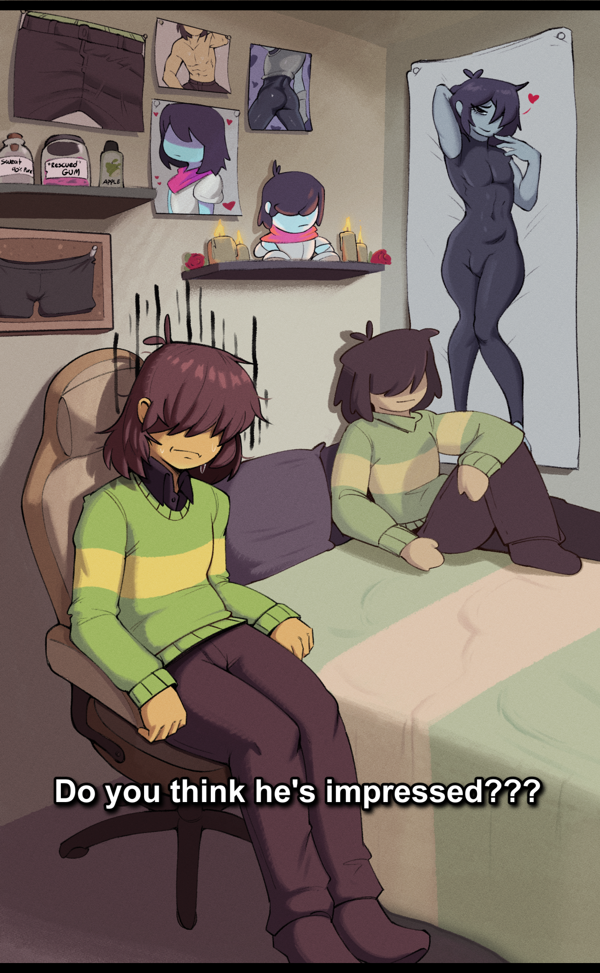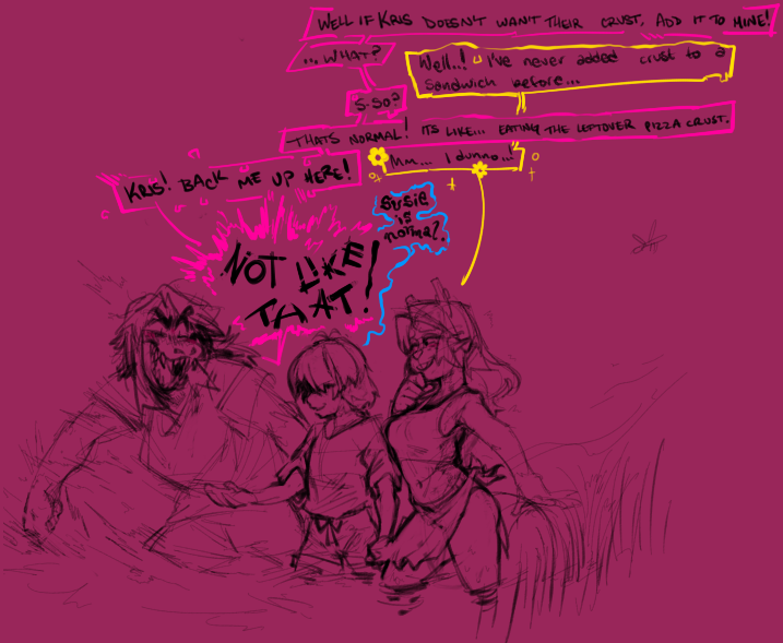 >>80672178My sadistic ass, hoping we see Chara next chapter and I get ANY chance to get Kris and Chara to hang out. Especially if it is revealed in an insane twist that the phone call in Normal route is with Chara.Can anyone tell I run on copium?