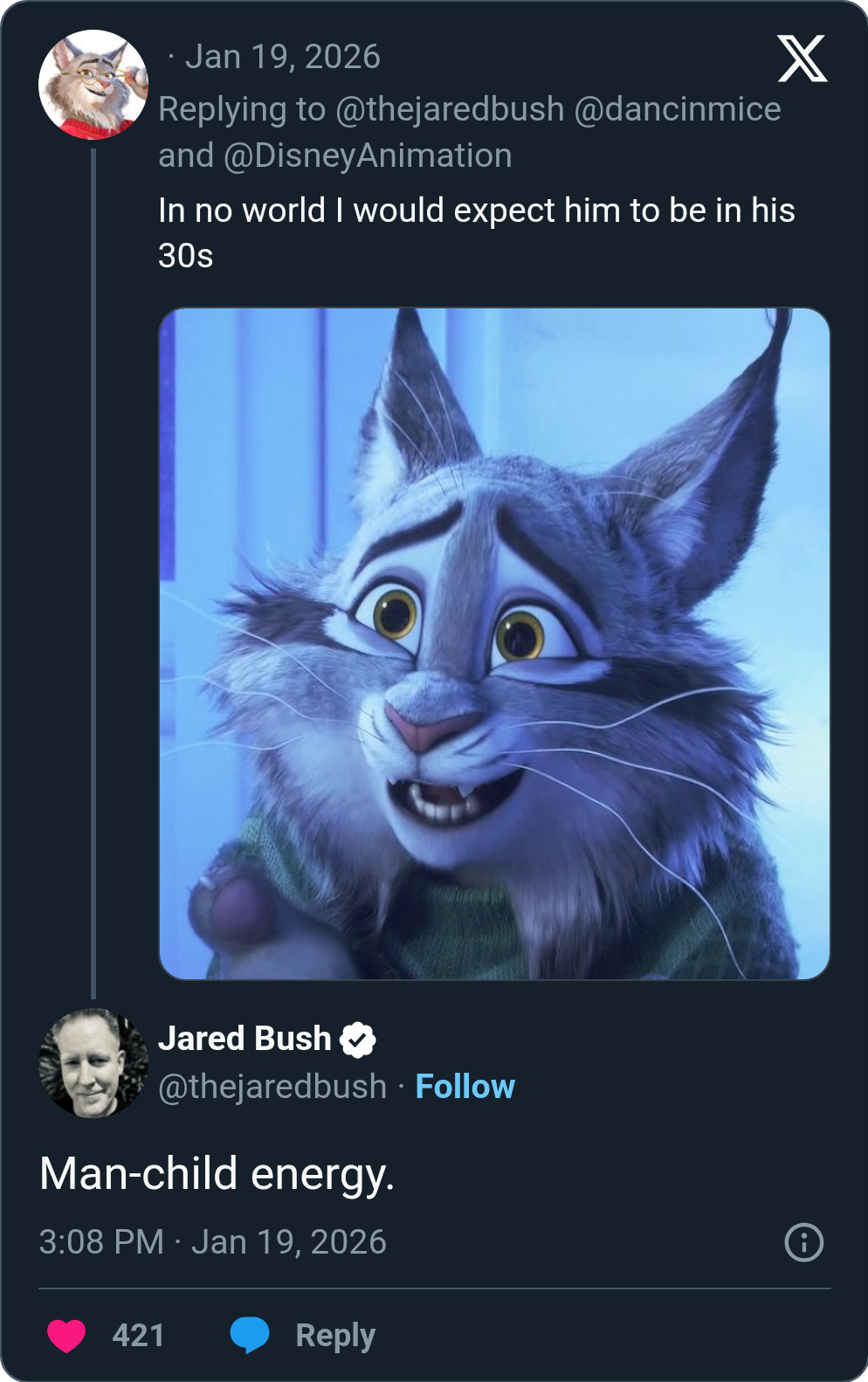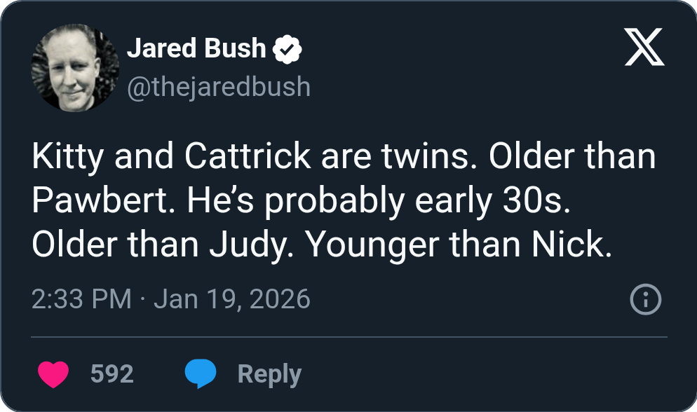 >link>comment on Pawbert being in his earlier 30shttps://x.com/thejaredbush/status/2013379434519113913?s=20>manchild commenthttps://x.com/thejaredbush/status/2013388228313915834?s=20