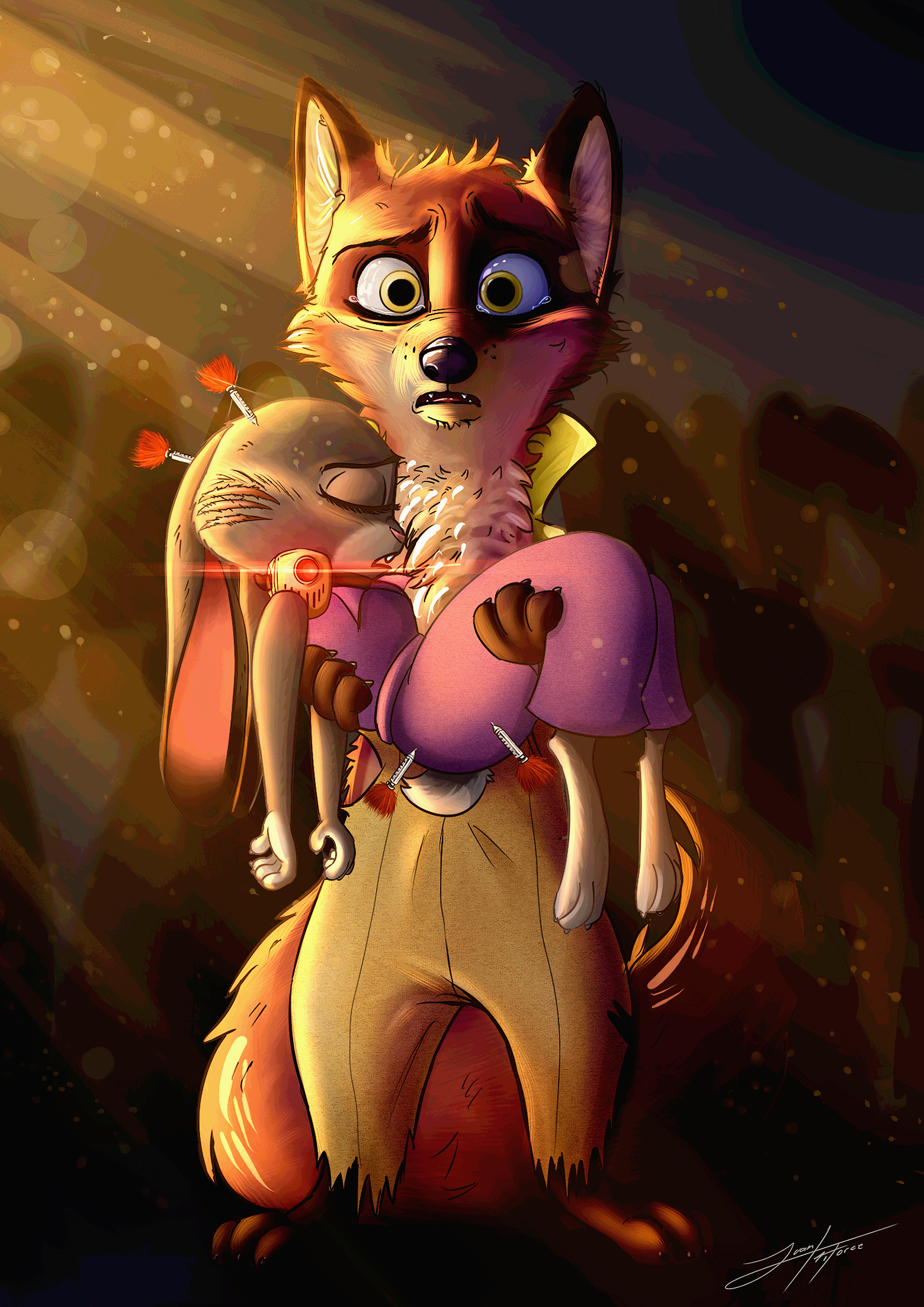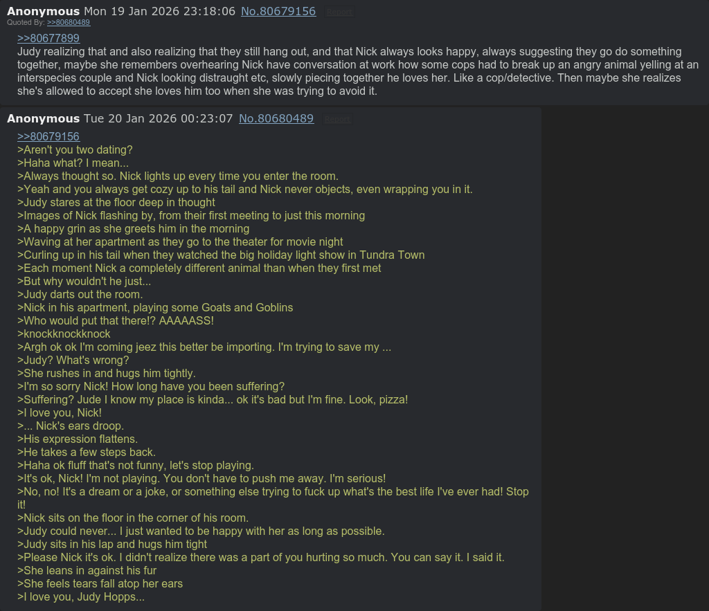 >>80679156>Aren't you two dating?>Haha what? I mean...>Always thought so. Nick lights up every time you enter the room.>Yeah and you always get cozy up to his tail and Nick never objects, even wrapping you in it. >Judy stares at the floor deep in thought>Images of Nick flashing by, from their first meeting to just this morning>A happy grin as she greets him in the morning>Waving at her apartment as they go to the theater for movie night>Curling up in his tail when they watched the big holiday light show in Tundra Town>Each moment Nick a completely different animal than when they first met>But why wouldn't he just...>Judy darts out the room.>Nick in his apartment, playing some Goats and Goblins>Who would put that there!? AAAAASS!>knockknockknock>Argh ok ok I'm coming jeez this better be importing. I'm trying to save my ...>Judy? What's wrong?>She rushes in and hugs him tightly. >I'm so sorry Nick! How long have you been suffering?>Suffering? Jude I know my place is kinda... ok it's bad but I'm fine. Look, pizza!>I love you, Nick!>... Nick's ears droop. >His expression flattens. >He takes a few steps back.>Haha ok fluff that's not funny, let's stop playing. >It's ok, Nick! I'm not playing. You don't have to push me away. I'm serious! >No, no! It's a dream or a joke, or something else trying to fuck up what's the best life I've ever had! Stop it! >Nick sits on the floor in the corner of his room.>Judy could never... I just wanted to be happy with her as long as possible.>Judy sits in his lap and hugs him tight>Please Nick it's ok. I didn't realize there was a part of you hurting so much. You can say it. I said it. >She leans in against his fur >She feels tears fall atop her ears>I love you, Judy Hopps...