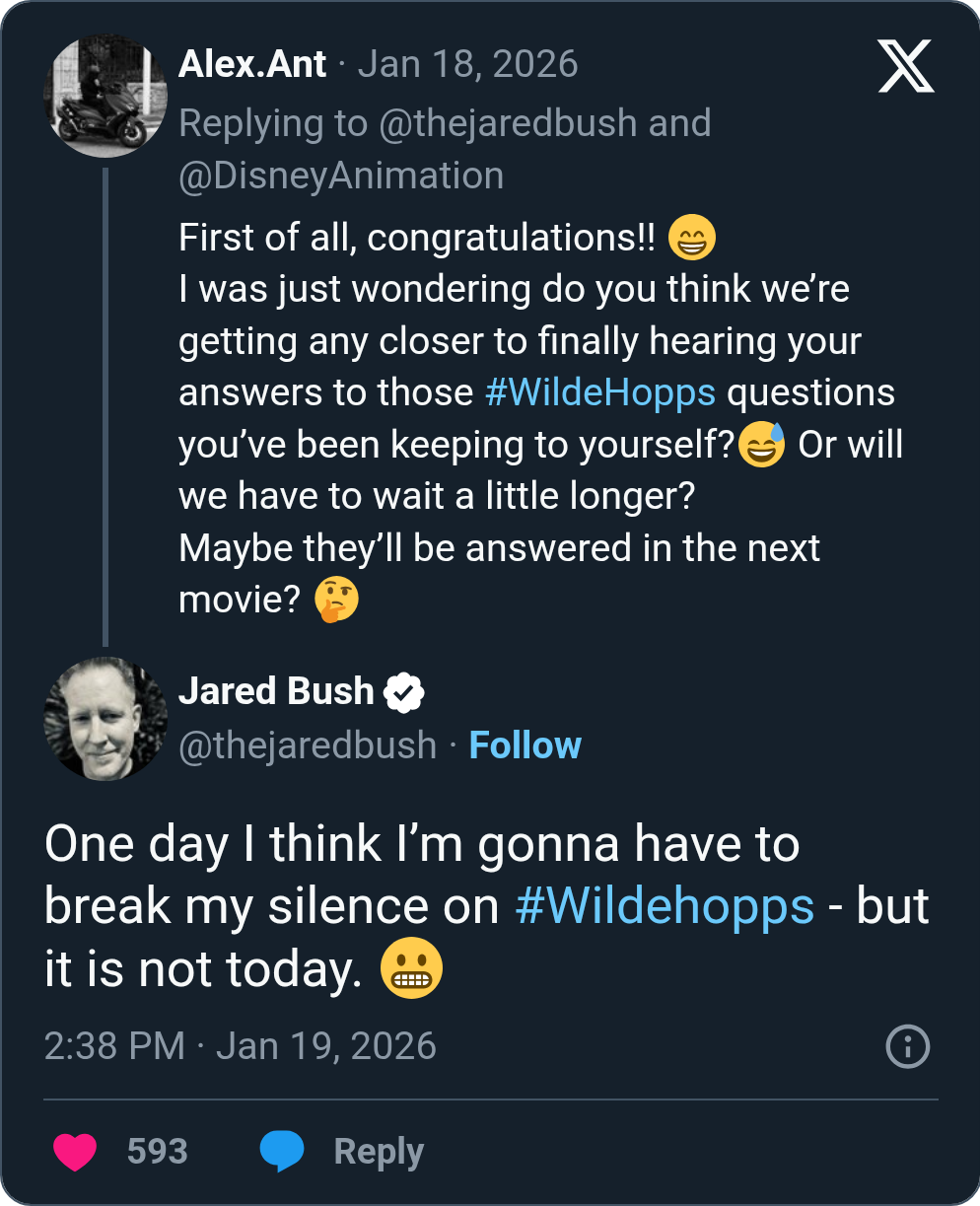 >>80681568>>80681723Oooooh, so juicy. Obviously he means that Judy is able to relax a little more now, not using every fiber in her being to prove herself at all times.And of course, the obvious assumption is that shes gonna hang out with Nick, but wheres the part about cleaning up his apartment?>>80681820Yeah since 2024 I believe Jared got a promotion. And hey, Im all for it with how Z2 turned out.>>80682772I mean considering those early interviews about them having to commit one way or the other eventually and now this recent tweet of him "having to break the silence eventually" it sounds like there will at least be some sort of confirmation, even if the whole Z3 plot isnt a romance. With how Z2 went Im having a REALLY hard time seeing them go the platonic route as well so keep your chin up buner.>>80683668I feel ya.