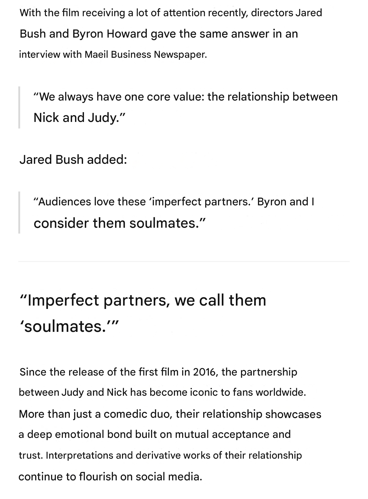 >>80703829Well there's also the aspect that Judy was hurt by a pred, a fox even, as a child. Nick was hurt by a group of prey animals as a child. So they both grew up with some biases. I'd say Judy had them to a lesser degree, but she still had them and didn't even realize it. They both ended up treating a good animal poorly (Nick early on, Judy later in Z1). So they over came those, became friends, but in 2 they go so beyond that with how they look at each other and interact. It's like because of their past they can be themselves with each other and yeah I can't think of any Disney couple that feels that genuine.
