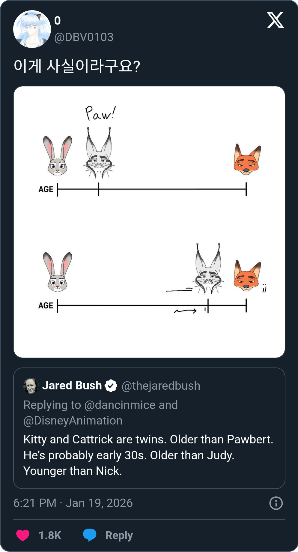 >>80689485>And of course, the obvious assumption is that shes gonna hang out with Nick, but wheres the part about cleaning up his apartment? Oh that was just the question that was asked, my app to capture Tweets got cut off. Jared loves saying he'll love to find out or vagueposting is just feeding into a bunch of stuff.Someone made a little graphic showing Pawbert's age change too, I always thought he was closer to Judy than Nick but now I guess not? Maybe Judy just has a thing for older guys being into her.>>80691546>A different future in which Nick and Judy never met.Well I read a fic where they never met... at that Jumbeaux Pop store. Instead, it's Judy having been a meter maid for three months with no missing mammal case and getting bored to death one night to go off on a blind date, only to get stood up. Luckily, a handsome young red-furred stranger gives her a good time instead :DDDD>Blind Datehttps://archiveofourown.org/works/11303409>>80693113We canonically have Bug-Burga, I'm like pretty sure everyone in the vertebrae kingdom is gonna be conscious in Zootopia, I don't think invertebrates will or do.