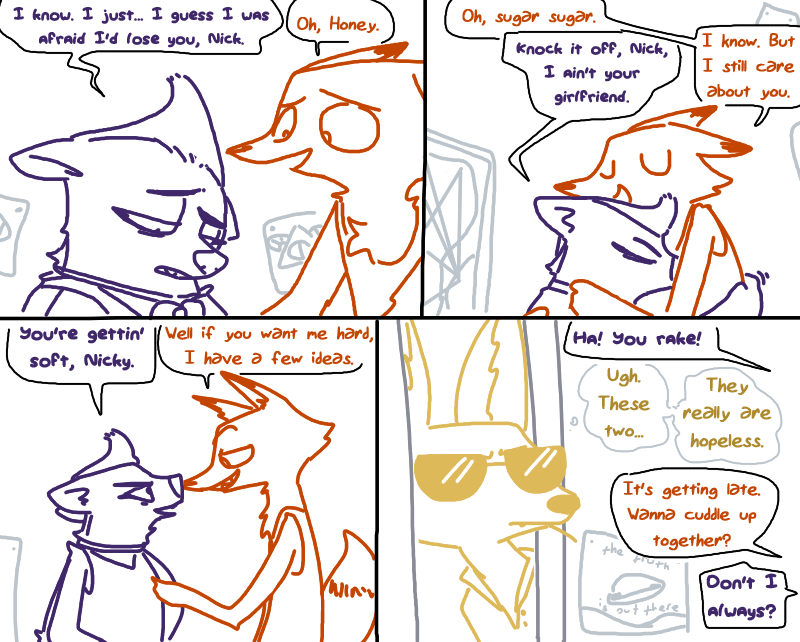 >>80677051I am literally writing this. Albeit after getting the 'hey, what, you're not dating' talk from everyone Judy then starts wondering 'so why hasn't Nick asked me out?' and discovers the reasons to be things like 'interspecies relationships are still very taboo in Zootopia, Nick knows this, Nick is content to be friends and thought Judy was something like asexual, and also that the relationship history from a streetkid turned gangster turned con artist run the gamut from depressing to fucking tragedy and that being Nick is suffering'.