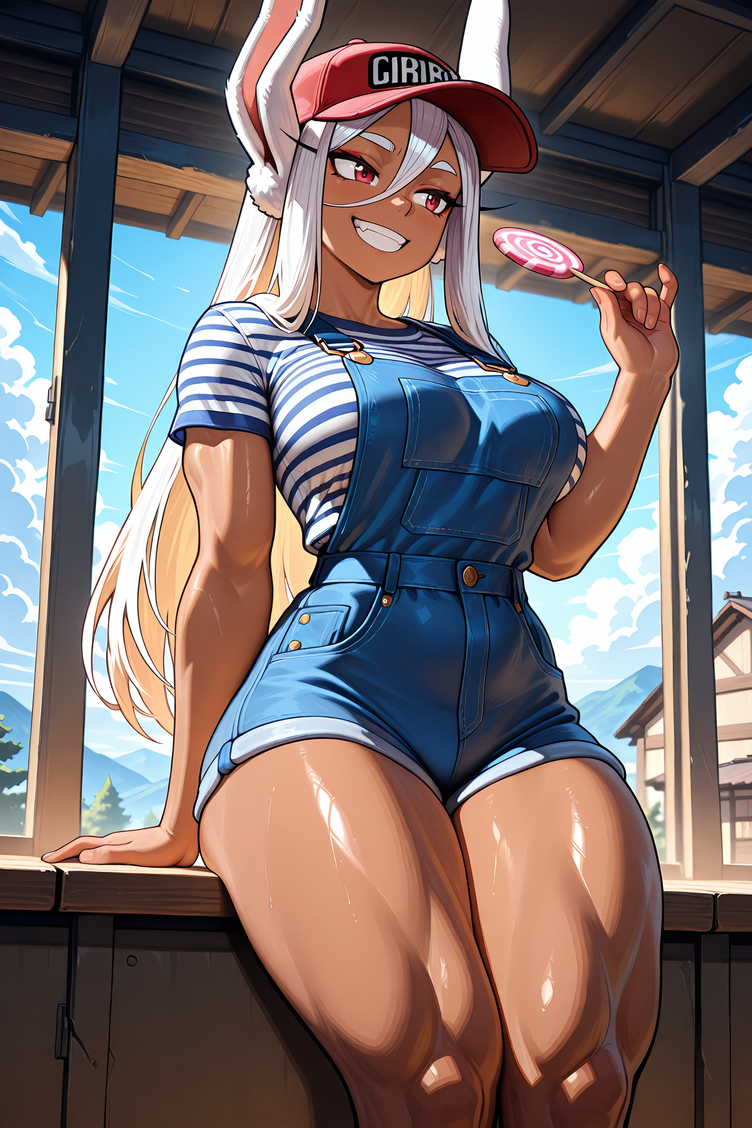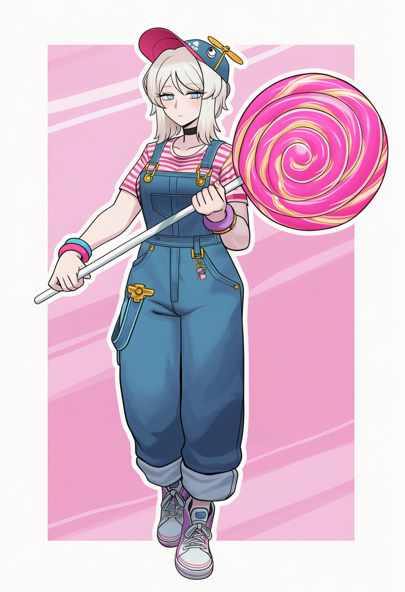 >>80689883Requesting your waifu wearing overalls, a striped shirt, and a propeller hat while holding a giant lollipop.
