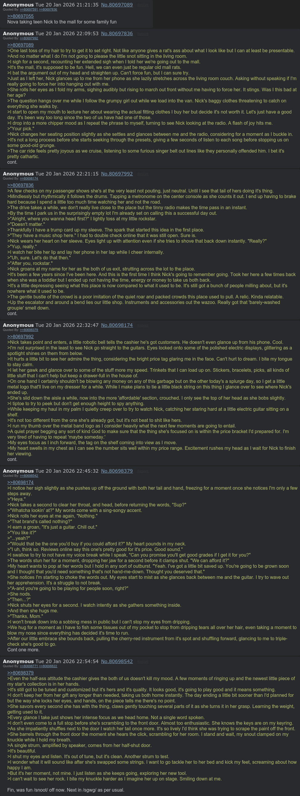 >>80697836>A few checks on my passenger shows she's at the very least not pouting, just neutral. Until I see that tail of hers doing it's thing.>Mindlessly but rhythmically it follows the drums. Tapping a metronome on the center console as she counts it out. I end up having to brake hard because I spend a little too much time watching her and not the road.>The drive takes a while, we don't really live close to the place but the tinny radio makes the time pass in an instant. >By the time I park us in the surprisingly empty lot I'm already set on calling this a successful day out.>"Alright, where you wanna head first?" I lightly toss at my little rockstar.>"Doesn't matter.">Thankfully I have a trump card up my sleeve. The spark that started this idea in the first place.>"They have a music shop here." I had to double check online that it was still open. Sure is.>Nick wears her heart on her sleeve. Eyes light up with attention even if she tries to shove that back down instantly. "Really?">"Yup, really.">I watch her bite her lip and lay her phone in her lap while I cheer internally.>"Uh, sure. Let's do that then.">"After you, rockstar.">Nick groans at my name for her as the both of us exit, strutting across the lot to the place. >It's been a few years since I've been here. And this is the first time I think Nick's going to remember going. Took her here a few times back when she was a toddler but I ended up not having the time, energy or money to take us both back. >It's a little depressing seeing what this place is now compared to what it used to be. It's still got a bunch of people milling about, but it's nowhere what it used to be.>The gentle bustle of the crowd is a poor imitation of the quiet roar and packed crowds this place used to pull. A relic. Kinda relatable.>Up the escalator and around a bend lies our little shop. Instruments and accessories out the wazoo. Really got that 'barely-washed groupie' smell down.cont.