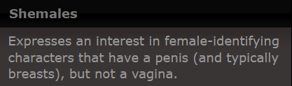 >>80754444>Why would words mean something else on F-list?Because the community said so. There's an actual transgender option for you if that's what you want.