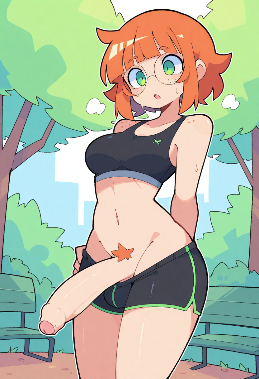 >>80813341Oops, forgot the prompts.Appearance: green eyes, freckles, medium breasts, thick eyebrows, brown eyebrows, eyebrow through hair, orange hair, medium hair, center-flap bangs, round eyewearBarista uniform: white shirt, green apron, bottomless, pubic hair, futanari, large penis, foreskinGym clothes: green sports bra, black yoga pants, crotchless clothing,