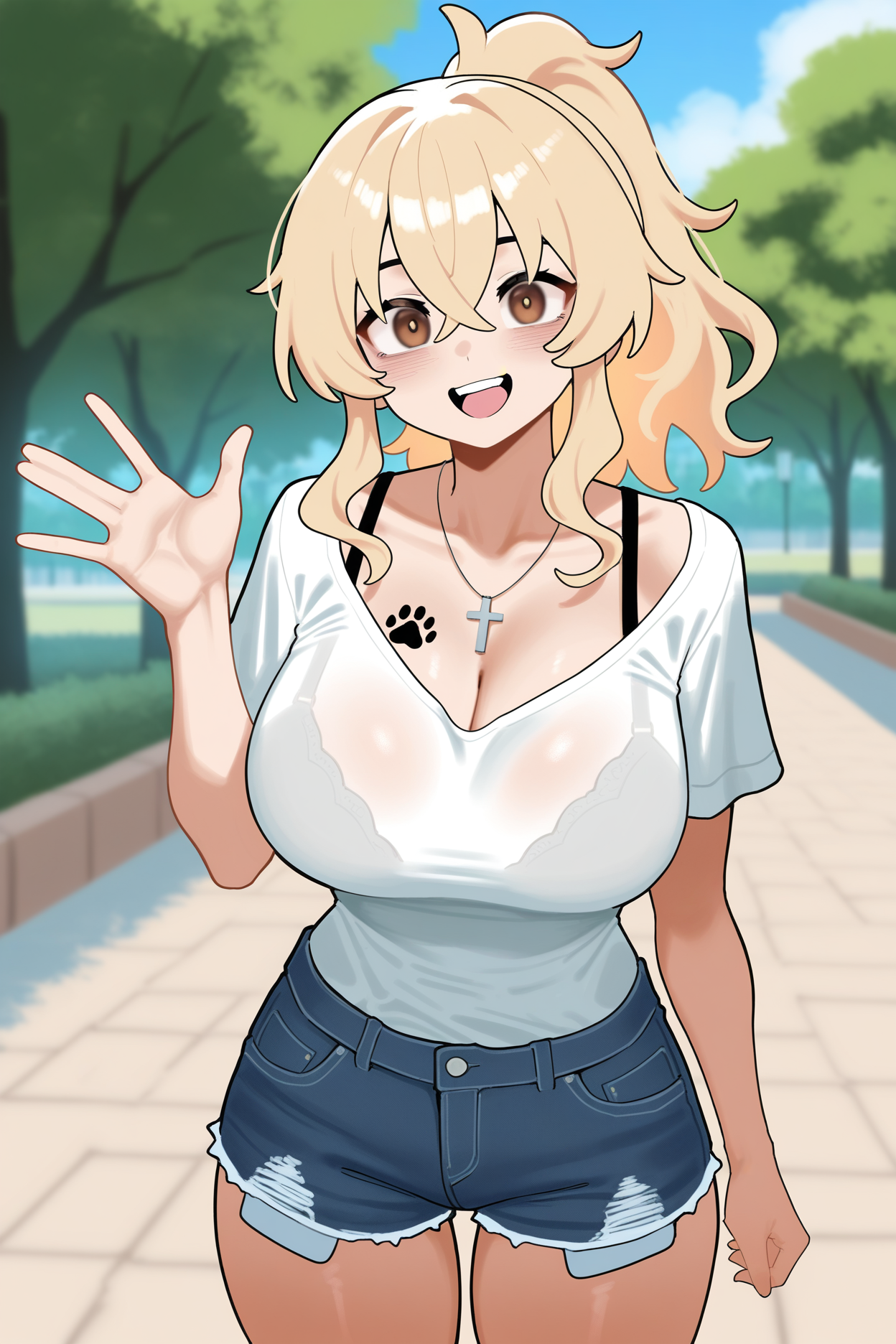 >>80812918>>80813341And I also have Katie. She does a lot of volunteer work for churches and charities, and is very selfless and kind. She also really likes dogs. Big male dogs specifically. She likes them a lot. You get the idea.Appearance: blonde hair, brown eyes, ponytail, wavy hair, crossed bangs, large breasts, cross necklace, paw print tattoo, chest tattoo, taremeOutfit: white shirt, cleavage, denim shorts, bra strap