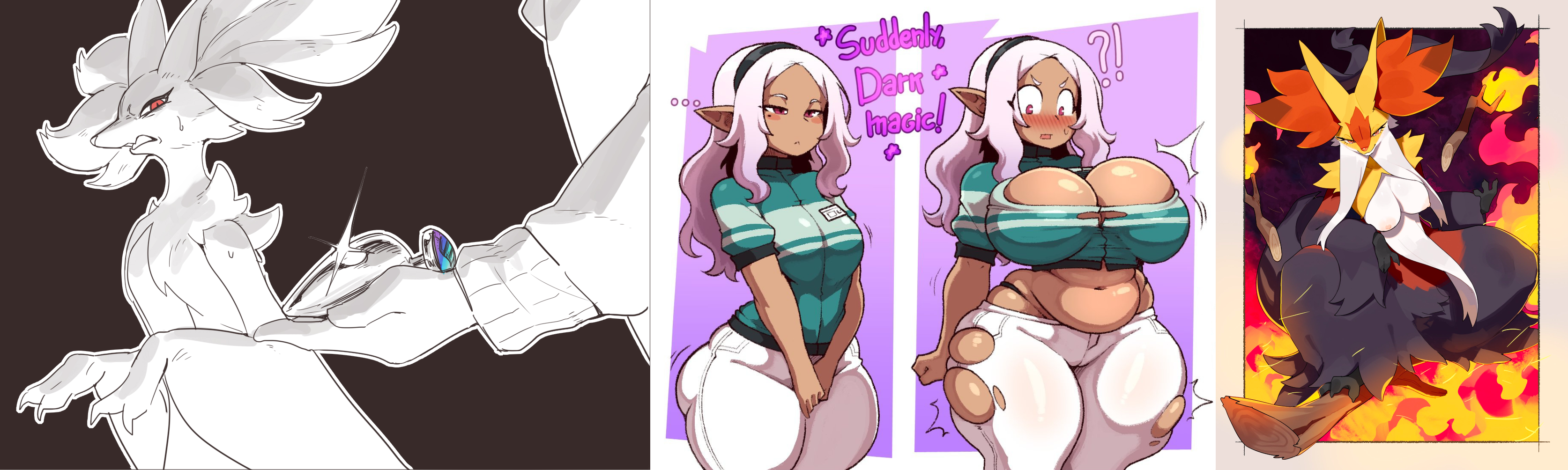 Requesting bustyboy female Meowstic wearing the same outfit as in the reference but showing his hyper bulge with the same expression as in the reference as well.You can use the reference on the right as an outfit reference for it as well.