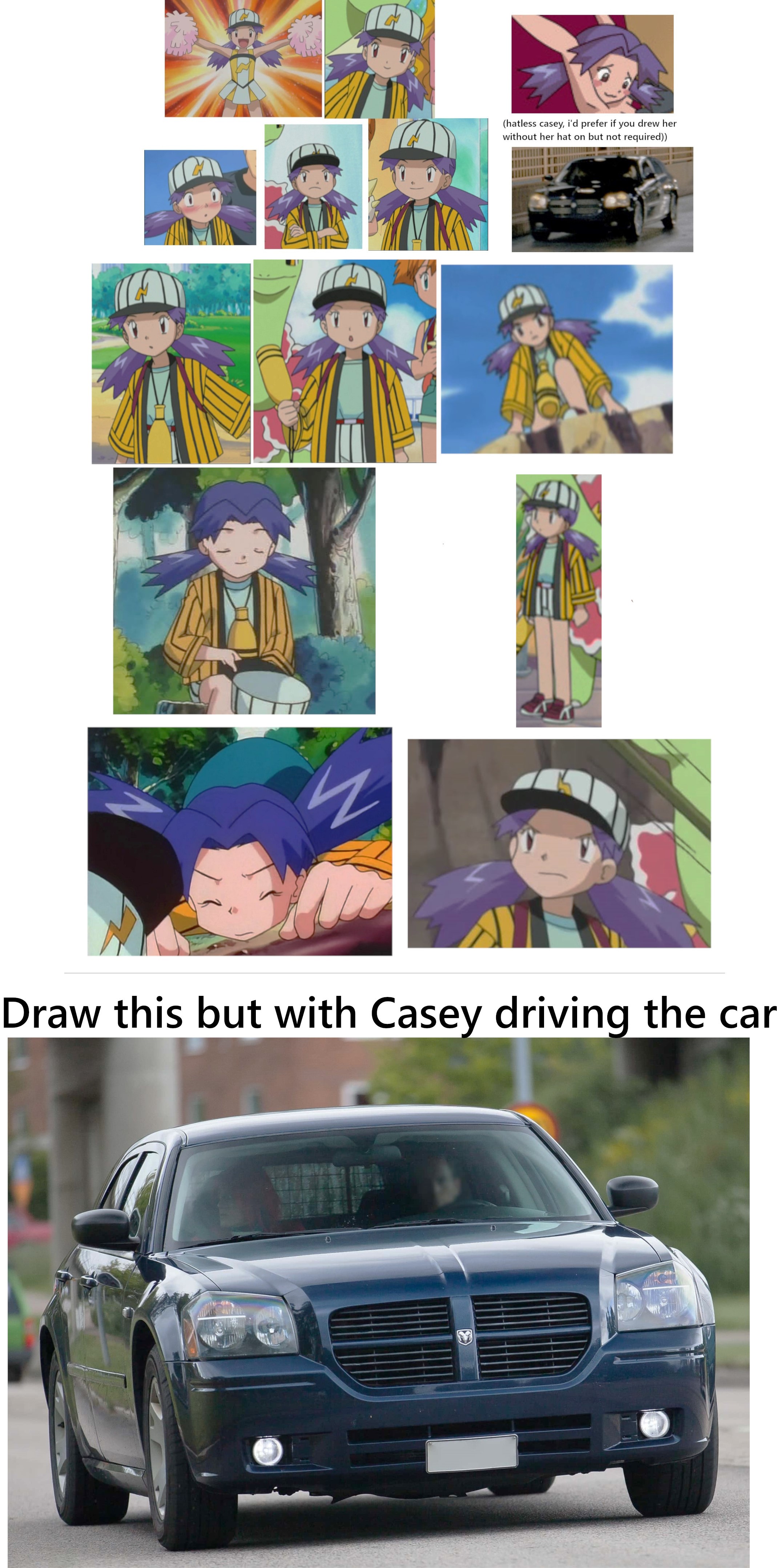 Draw Casey from Pokemon driving a dark blue Dodge Magnum