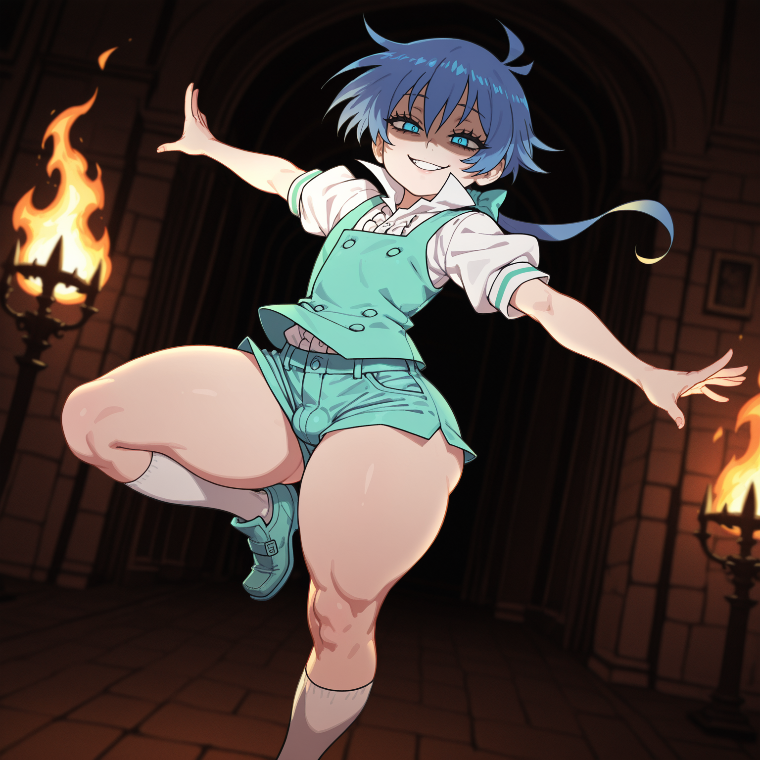 >>81001806Smug Joke (MHA) in her Hero costume giving a standing thighjob, but gripping the cock in such a way that it only touches the crotch and inner legs of her shorts and not the bare skin of her legs, like in picrel