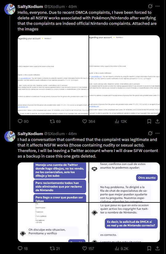 >>81057281SaltyXodium is Colombian. There really aren't the same parody laws that protect American and European artists.The funny thing is that the Digital Millennium Copyright Act doesn't apply, he's not hosting or distributing official software or product art illegally. It's all his own art, which he publishes for free. In the US, where Nintendo of Latin America is actually based, there's no case against him.And, he's not subject to US jurisdiction where the DMCA is actually law.What this was, was an implicit threat that they'd have a representative in Colombia initiate a lawsuit which would cripple his livelihood and drown him in legal costs, and even if he did try to fight it, he'd lose, and have his public reputation permanently ruined as a result.Nintendo can't actually do this to Americans or Europeans as easily unless they're selling exclusive access to works that they don't publish for free. But anywhere else in the world, just the threat, not even made through the proper channels for a given country, is more than enough.