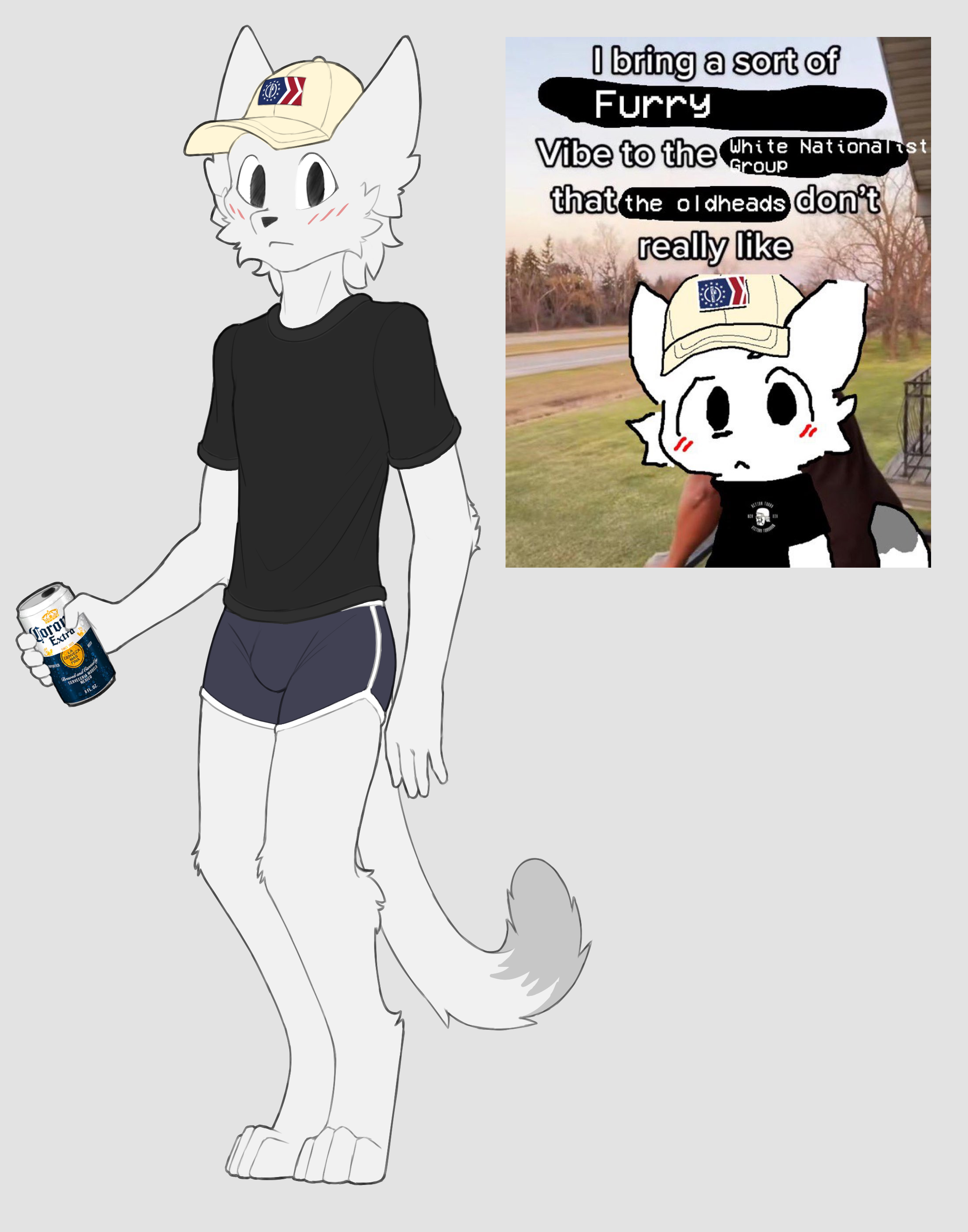 I liked the pic so I drew the boykisser. The flag on the cap is Patriot Front, but I couldn't find the skull on the shirt because reverse image search only yields the SS Totenkopf. I'd rather leave the shirt blank than place the wrong symbol.Also, I am not American so I don't know what kind of beer would be most appropriate for this context, so I randomly picked Corona.