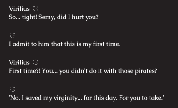 >>81092388There IS an actual virginity check that keeps track of who Semy gave his first time to that alters dialogue sometimes, like how Stearing gets a bit ticked off when meeting the pirates for the first time if you didn't save yourself for him, so yes.