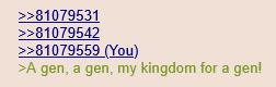 >>81079531>>81079542>>81079559>A gen, a gen, my kingdom for a gen!
