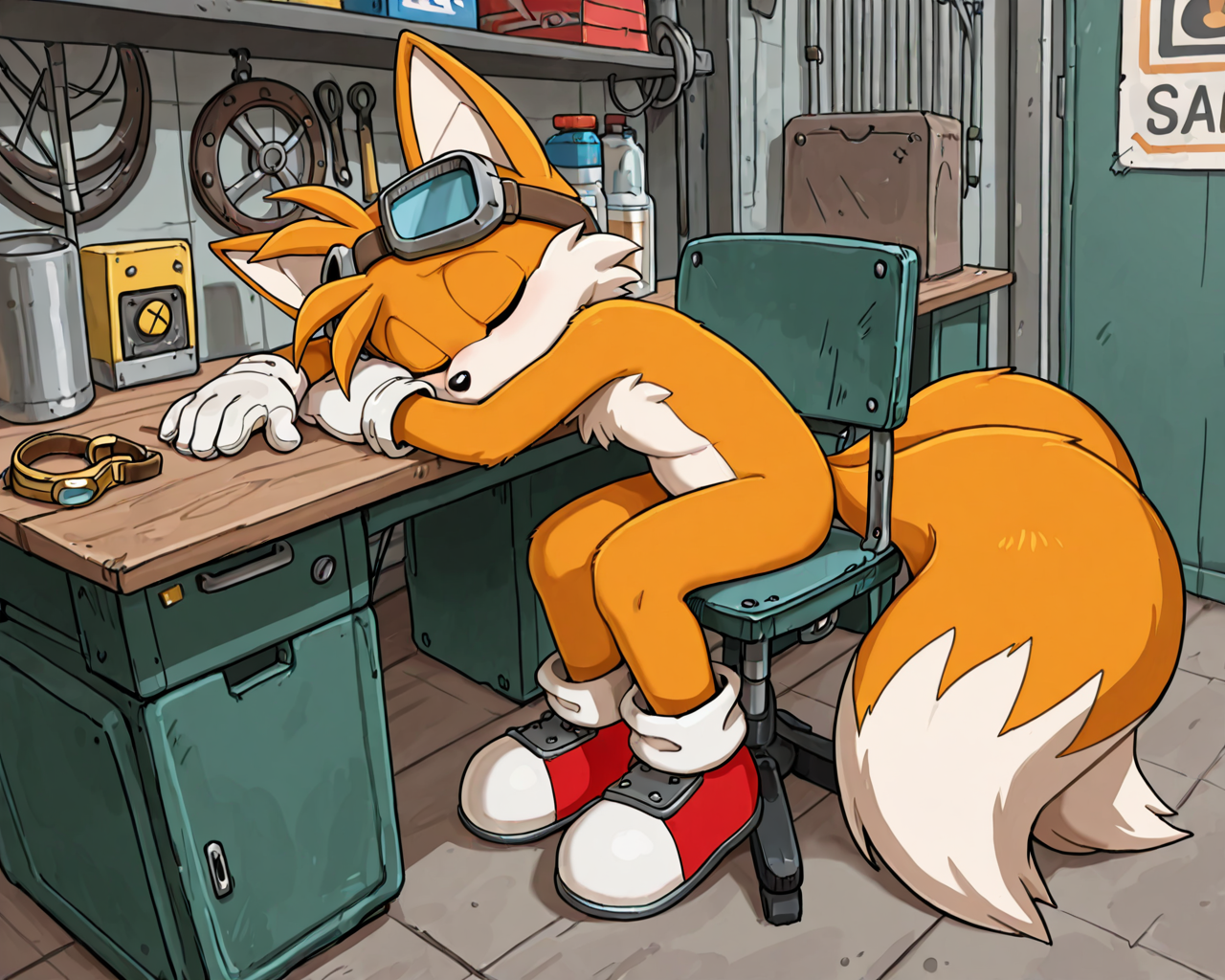>>81084332Tails falling asleep at his workbench.