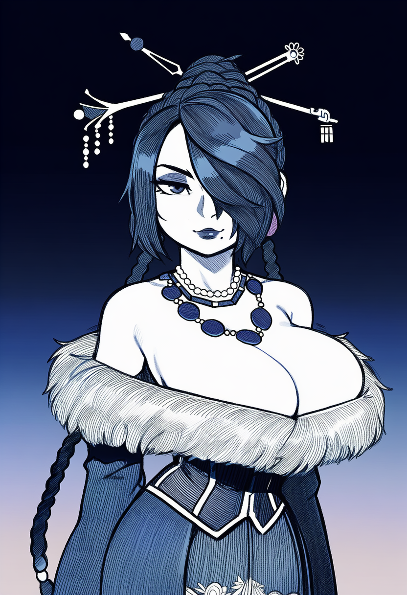 >>81114730A big boobed victorian maid in a very soft art style, but she also has modern glasses and heels.