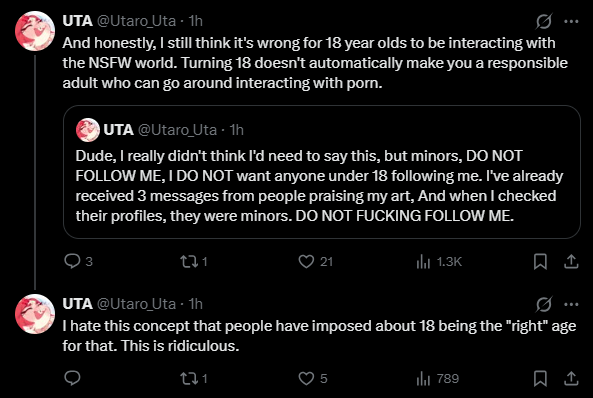 >>81138386This artist is literally 18-19 so they can shut the fuck up and were posting art nsfw before being 18. They are also one of the most miserable people to talk to and deal with and have insane attachment issues.
