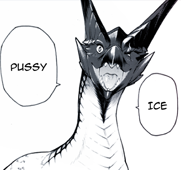 >>81131878I know it's supposed to be read right to left, but all I can see is Pussy Ice, which creates mental imagery of Legiana lifting up her tail and dispensing a bunch of ice cubes out of her slit, like it's some kind of party trick.Probably something she can do that Velk can't.