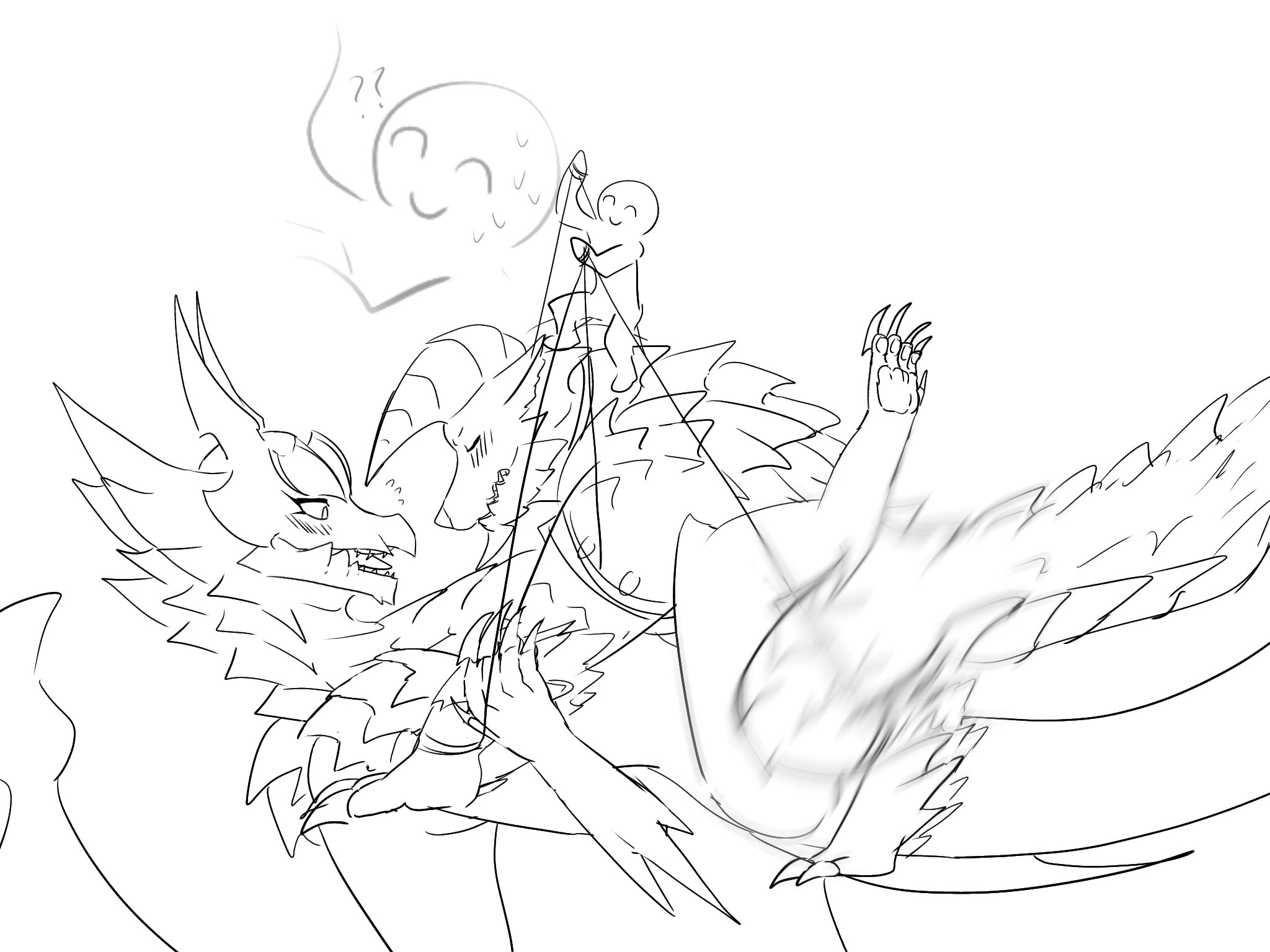 >>81124069>be Azurian rider>was captured by Vermeil scums>currently spending the night in one of their outpost, will probably be shipped to their lands tomorrow>have both my hands and legs attached with metal chains>Legi, my Legiana, is tightly bound with ropes next to me>thankfully these idiots didn't search me properly and missed my boot knife>I can free Legi but I'll still have my arms and legs bound>thankfully she'll be smart enough to pick me up in her talons and carry me home>as I finish going through the thick rope, it visibly loosens but Legi doesn't make a move>I look at her expectantly, but she just turns her head and open wide>her hot and damp breath washes over me>turns out she had another idea in mind to carry me>I shimmy next to her massive talons and elbow them a few times, but she insists>the guards suddenly raise a light and we're both exposed>no time to think, I dive into her maw and land against her tongue>she gets up and take off in a swift move, with me pressed against her palate>have my head only centimeters from her throat, the wind of her heavy breaths both cooling my sides and forcing her air into my lungs>we spend a few minutes like this, the scream from the outpost slowly fading away>she starts relaxing a little and stops pressing me as hard with her tongue>she finally lands after a while and drops me to the ground, just when I started getting used to the smell>we try our damnest but there's no removing my bindings>I point at her talons again but she just stares with drool at the corner of her mouth>...it wasn't that bad the first time, I guess