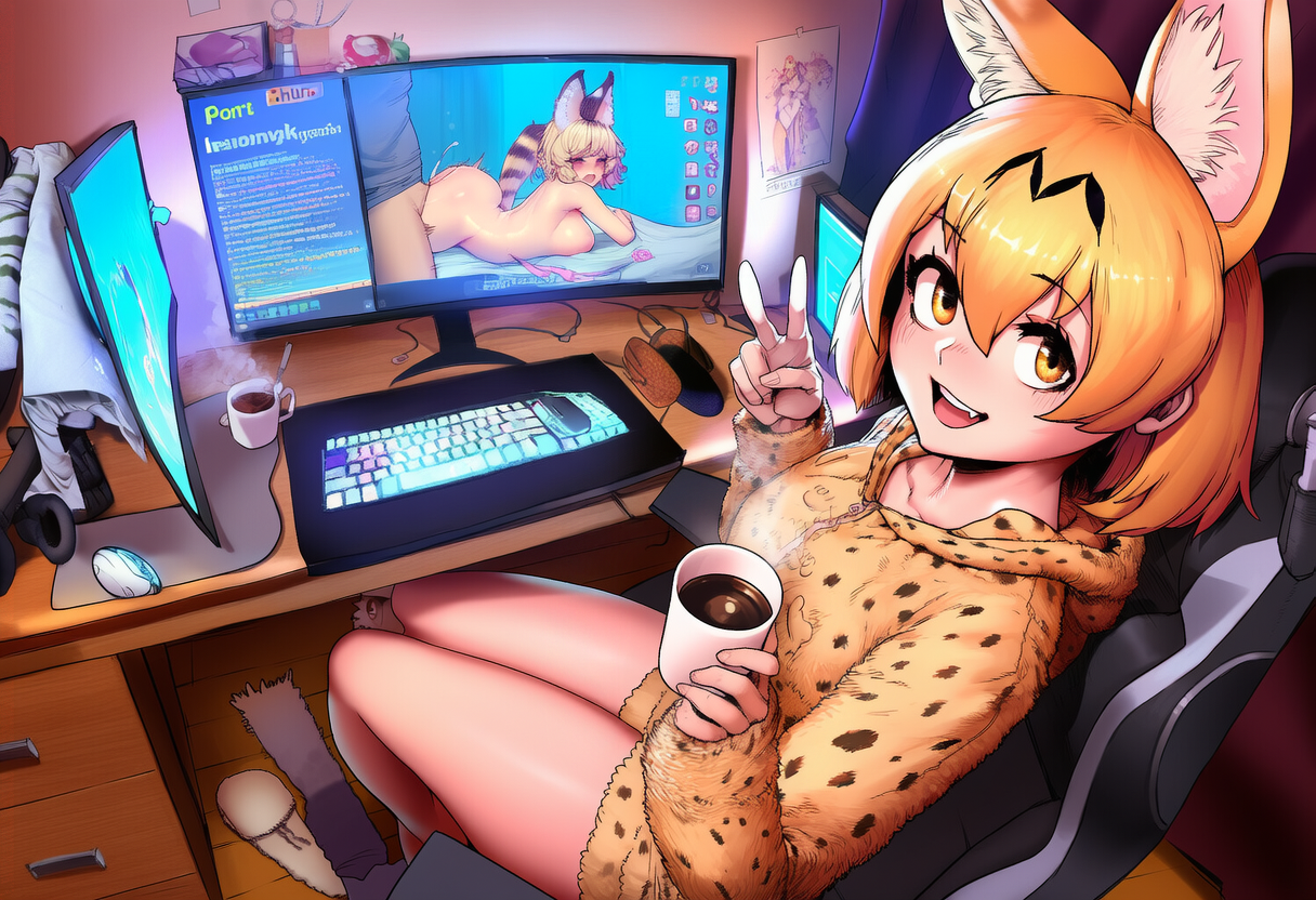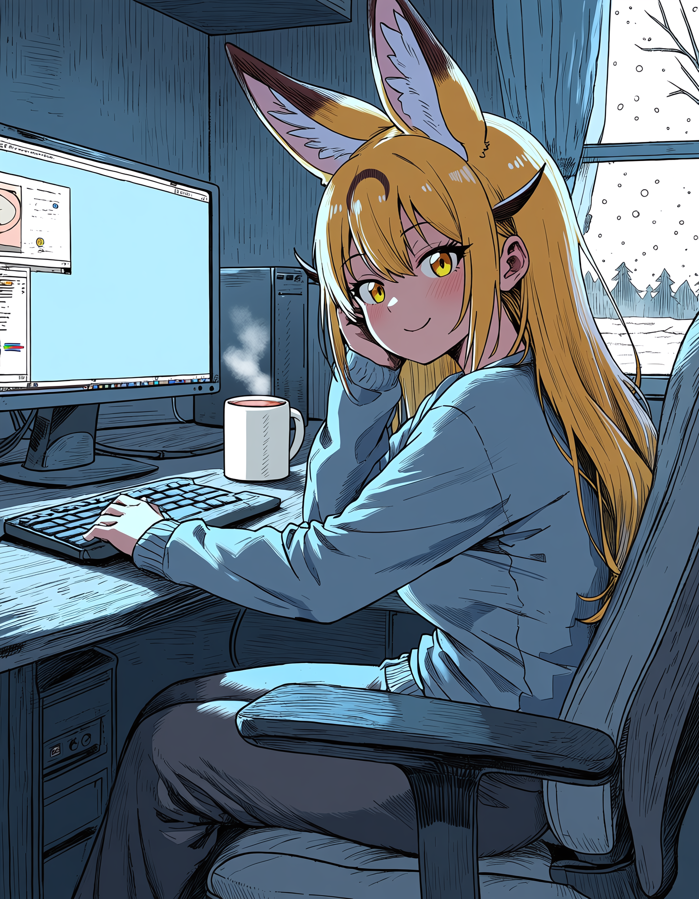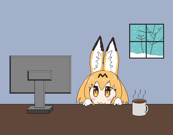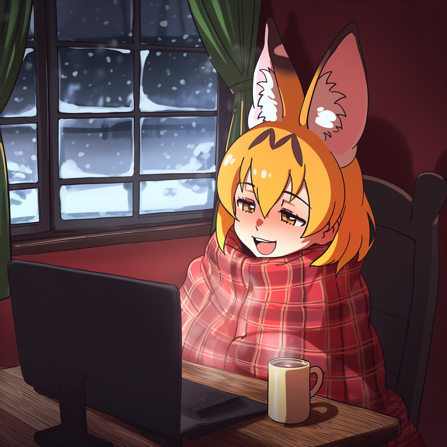 >>81122782Requesting an extremely comfy Serval sitting in front of a computer with a mug of cocoa while it snows outside
