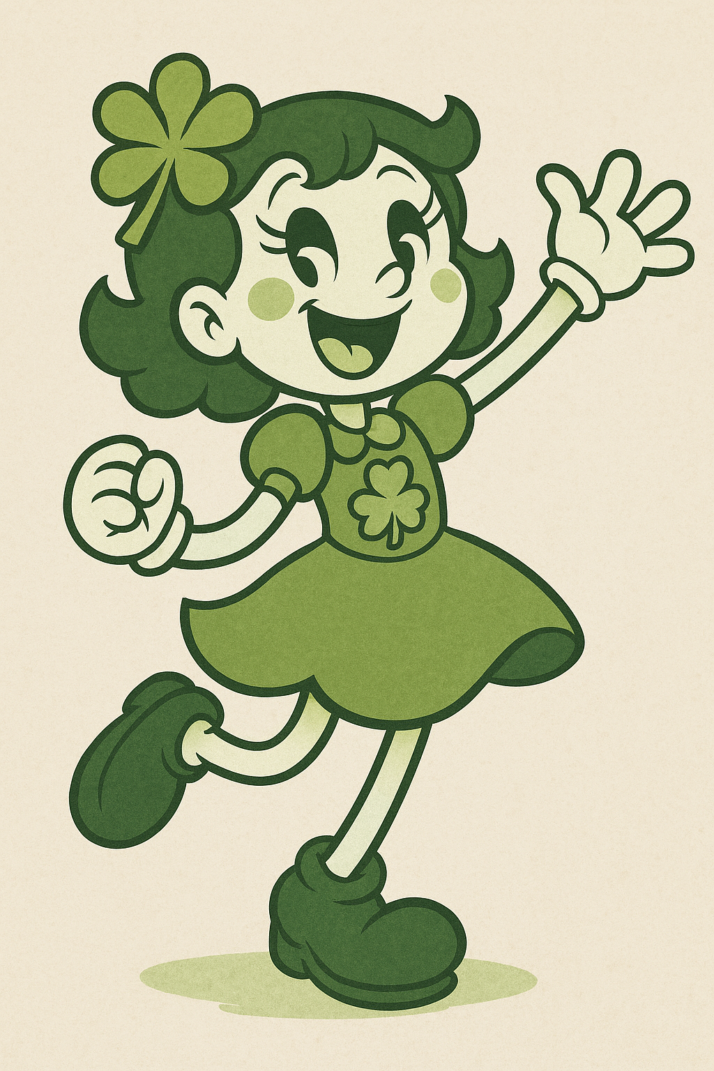 AI's attempt at Channel when I prompt it with "a female character stylized in the old cartoony 'rubber hose' animation. her colors are white and various shades of green. her motif is a four leaf clover. she's young and bubbly and loves to have fun and play games"