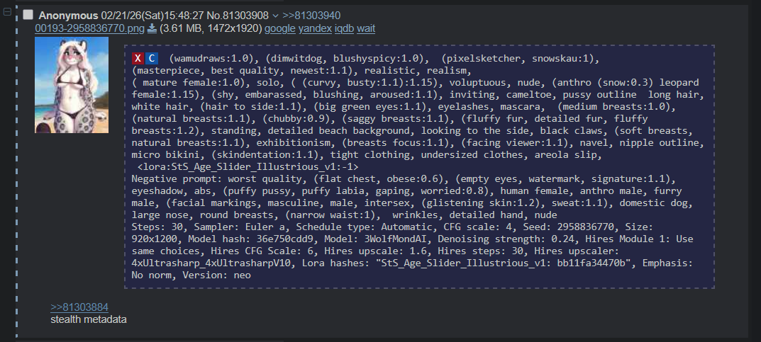Mink Stink Removal EditionPrevious: https://desuarchive.org/trash/thread/81288358LOCAL INSTALL>Getting Started Guide and FAQhttps://rentry.org/sdgguidehttps://rentry.org/sdgfaq>reForge UIhttps://github.com/Panchovix/stable-diffusion-webui-reForge>ComfyUIhttps://github.com/comfyanonymous/ComfyUI>AMD specific guideshttps://github.com/CS1o/Stable-Diffusion-Info/wiki/Webui-Installation-GuidesPOPULAR MODELS3WolfMondAI/StableMondAI: https://huggingface.co/Xeno443Sneeds / Manticore: https://civitai.com/user/Anomalous_AnonymousNova: https://civitai.com/user/CrodyChroma (Flux): https://huggingface.co/lodestones/ChromaZIT: https://huggingface.co/Tongyi-MAI/Z-Image-TurboMore models & comparison:https://rentry.org/truegrid-modelsGUIDES>Prompt and Inpaint guide Collectionhttps://rentry.org/fluffscaler-noobhttps://rentry.org/fluffscaler-inpainthttps://rentry.org/fluffscaler-duosZIT: https://gist DOT github.com/illuminatianon/c42f8e57f1e3ebf037dd58043da9de32>ComfyUI guideshttps://rentry.org/comfyui4a1111https://rentry.org/comfyui_guide_1girl>Lora training guideshttps://civitai.com/articles/3522https://rentry.org/fluffscaler-loraRESOURCES>Artist style gallerieshttps://rentry.org/3wolfmondai-doomphttps://rentry.org/stablemondai-doomphttps://rentry.org/doomp>Grids and other thingshttps://rentry.org/truegridhttps://rentry.org/sdgguide#lora-collects>Models & Loras repository, online generationhttps://civitai.com/https://tensor.art/https://novelai.net/EXTRAS>AI booruhttps://e6ai.net/PROMPT SHARING4chan wipes embedded prompt metadata from PNG uploads.Get the browser extension to easily share and retrieve prompts!https://rentry.org/sdgfaq#what-is-a-catboxPost a catbox example of a best-effort attempt if you need help with something