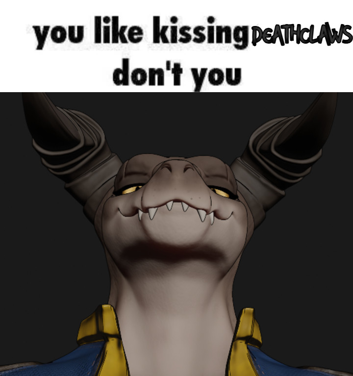 >>81301903Can't believe there's a whole vault of intelligent Deathclaws. They have a hard time fitting into the vault jumpsuits though.